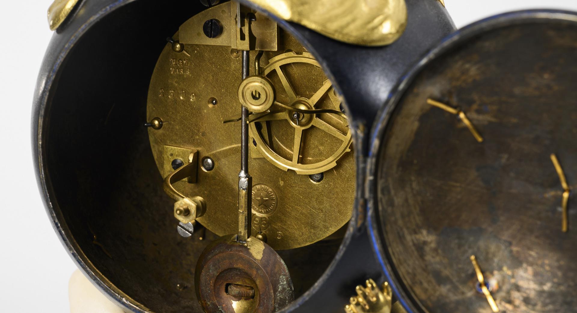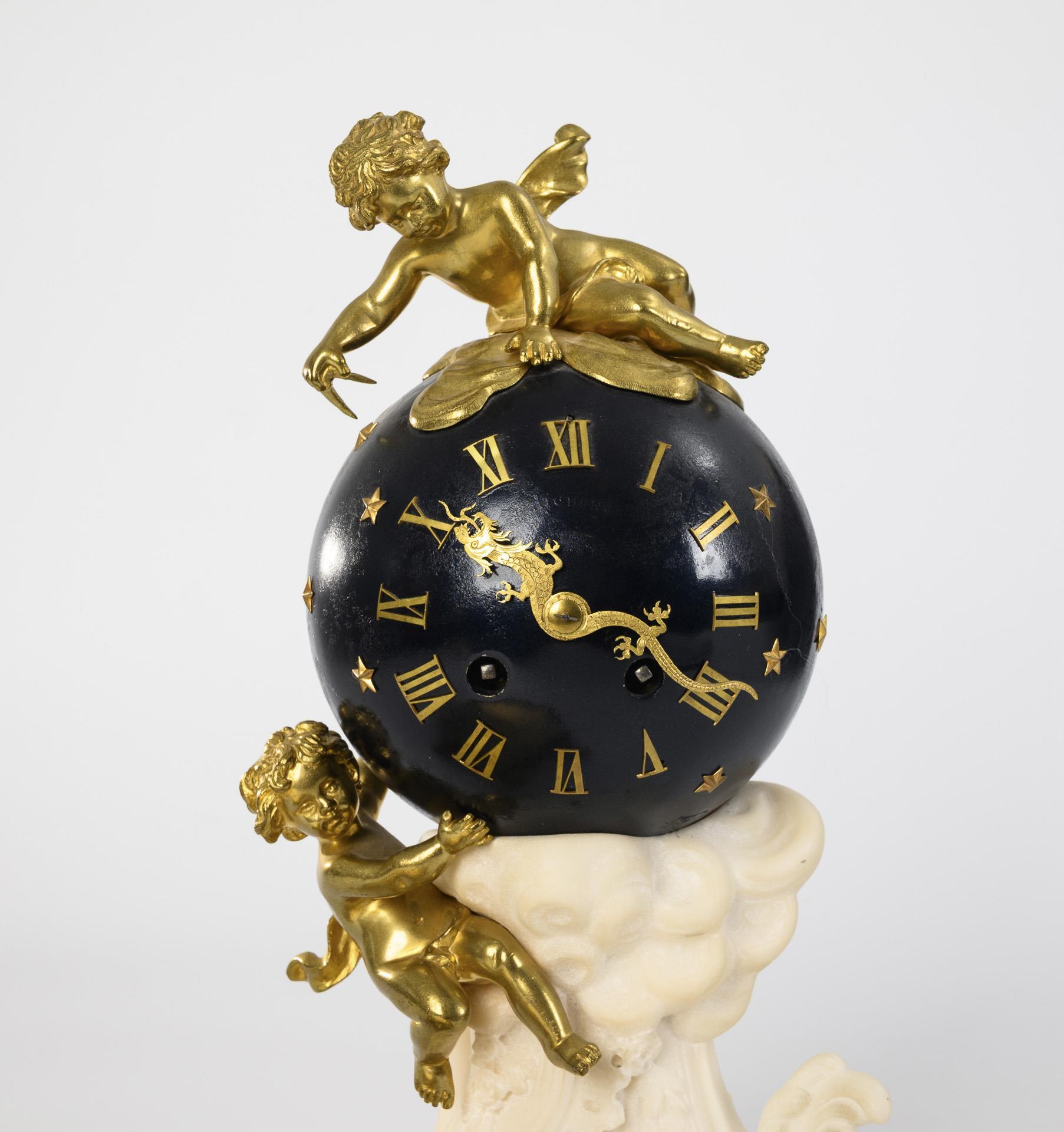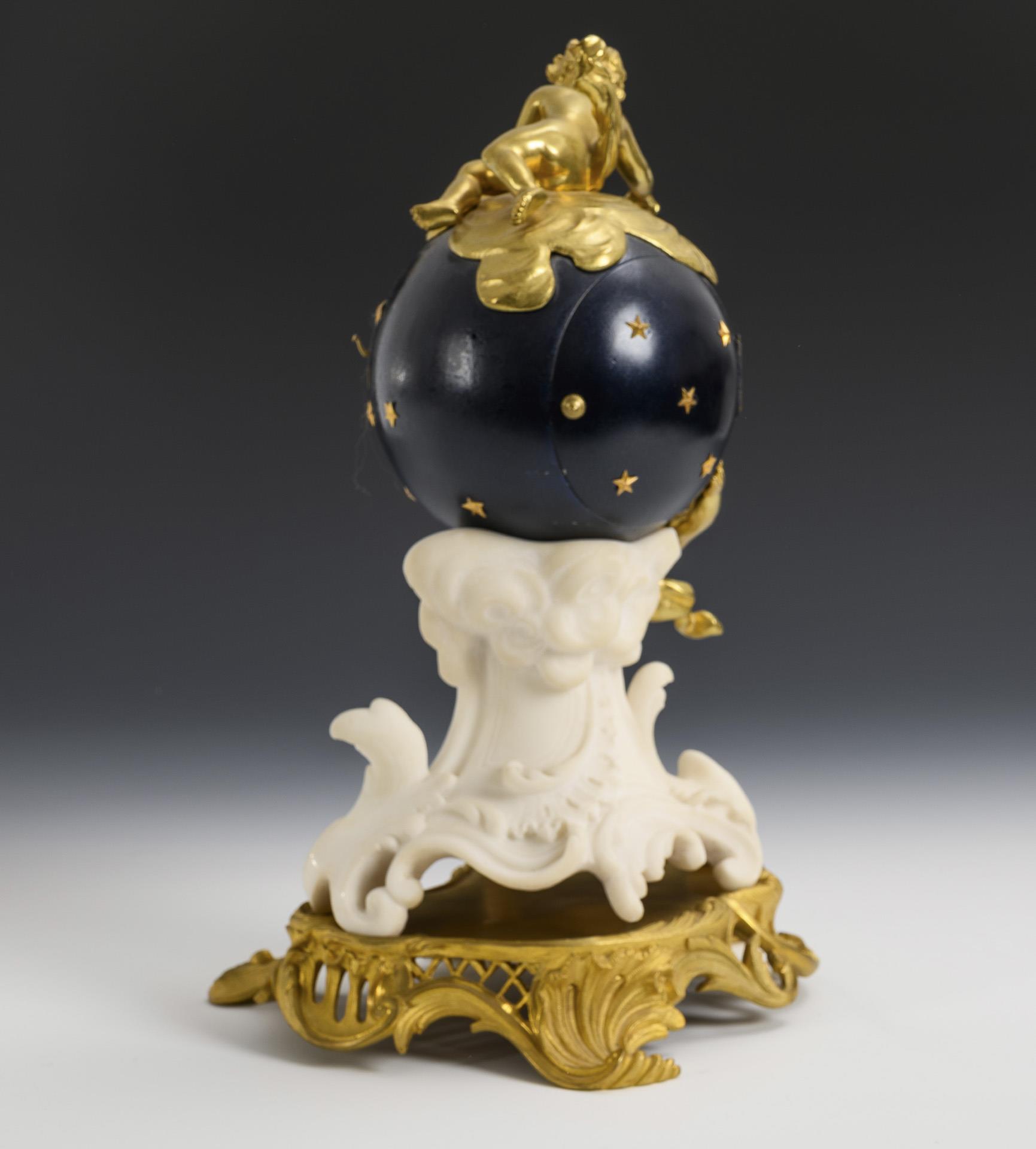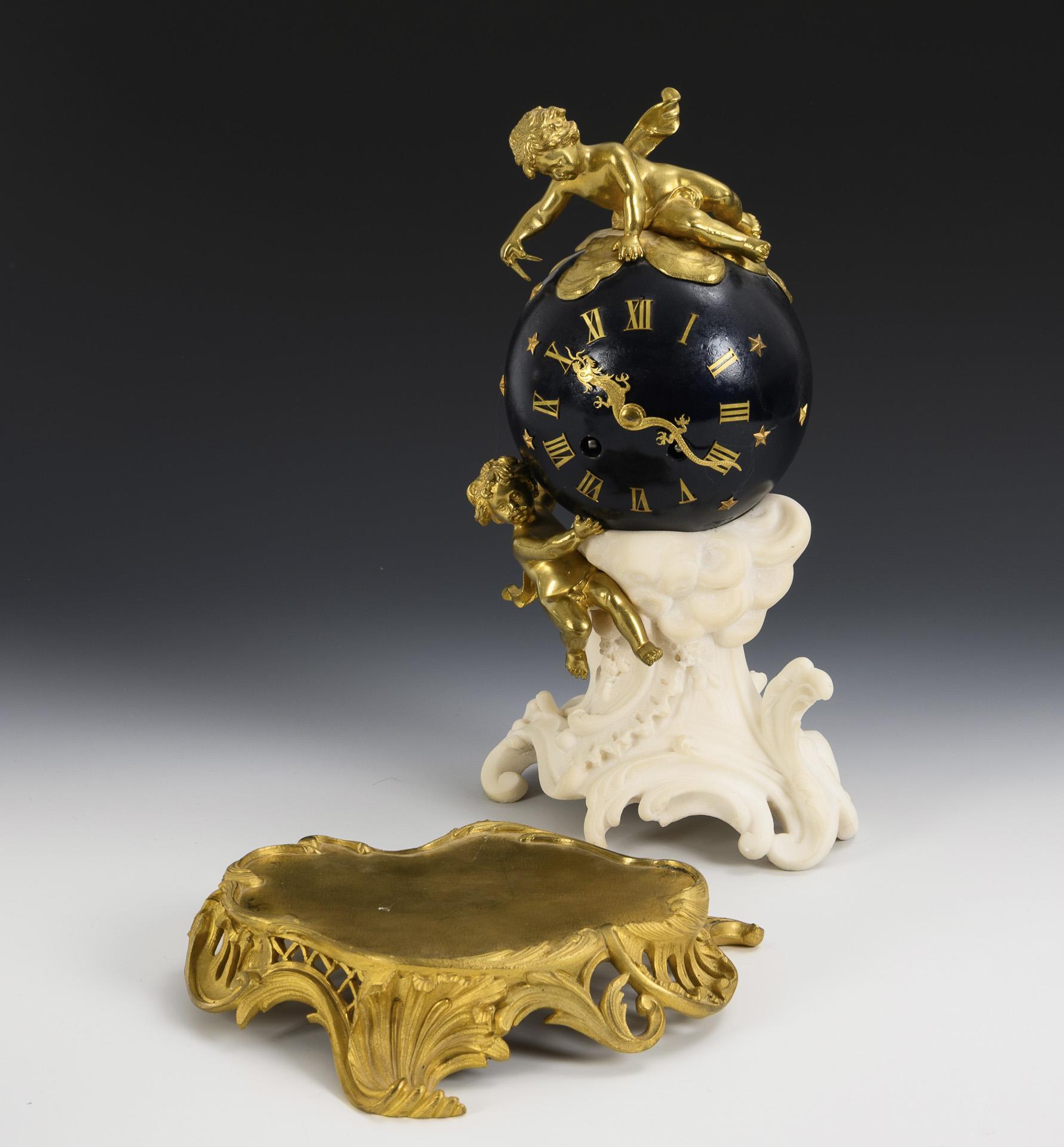 Historistische Tischuhr mit einem sternenbesetzten Kugelgehäuse mit 2 plastischen Putten, davon ein Putto mit Zirkel messend, auf Rocaille-Sockel. Dazu ein separater rocaillierter Gelbguss-Sockel. Partiell kleine Kantendefekte am Stein, Pendel gelötet.