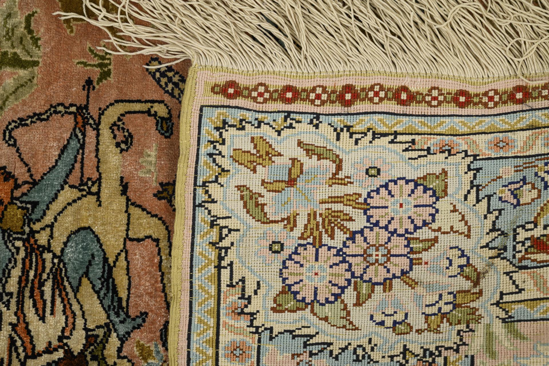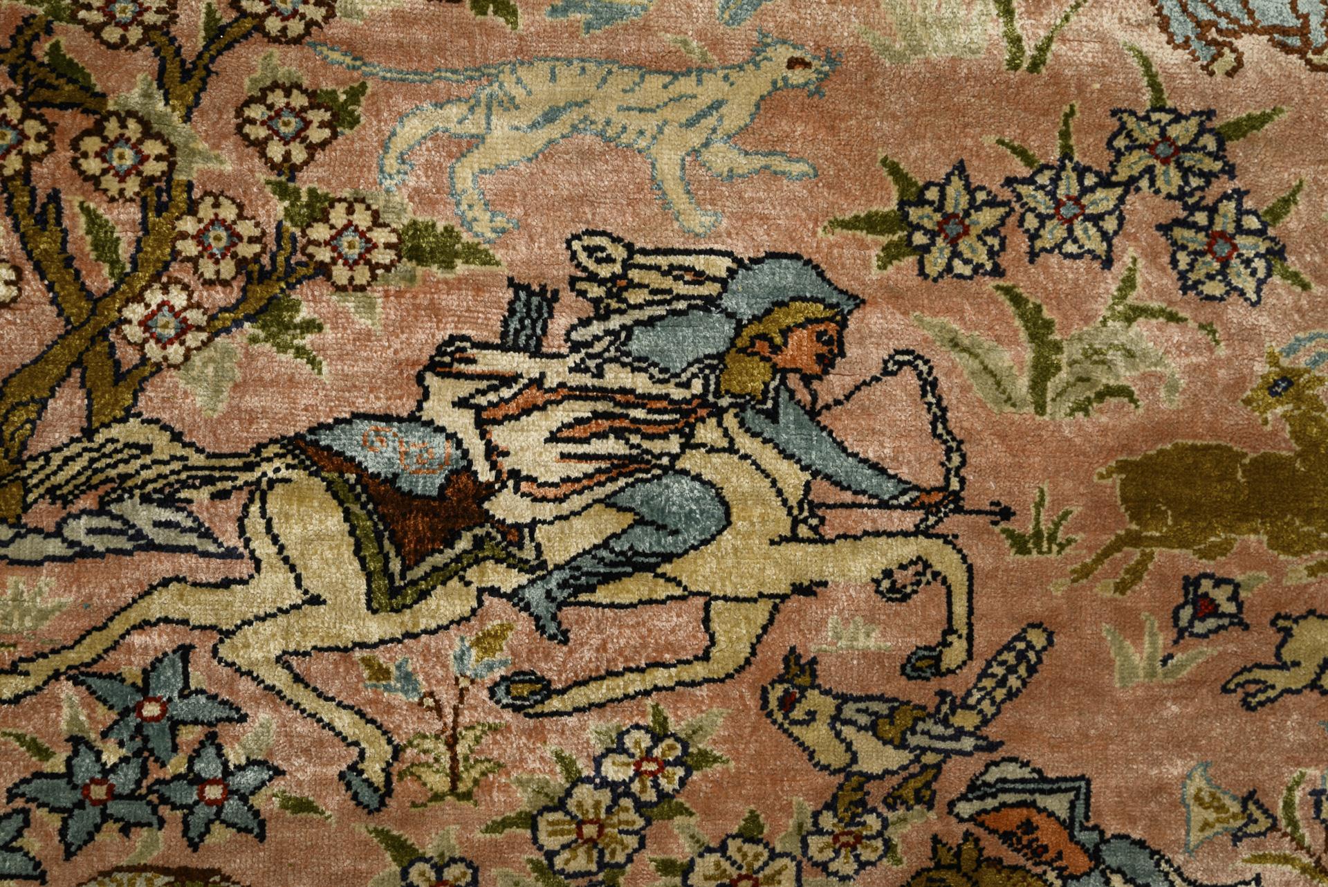 "Kayseri"-Seidenteppich mit Jagdszene.