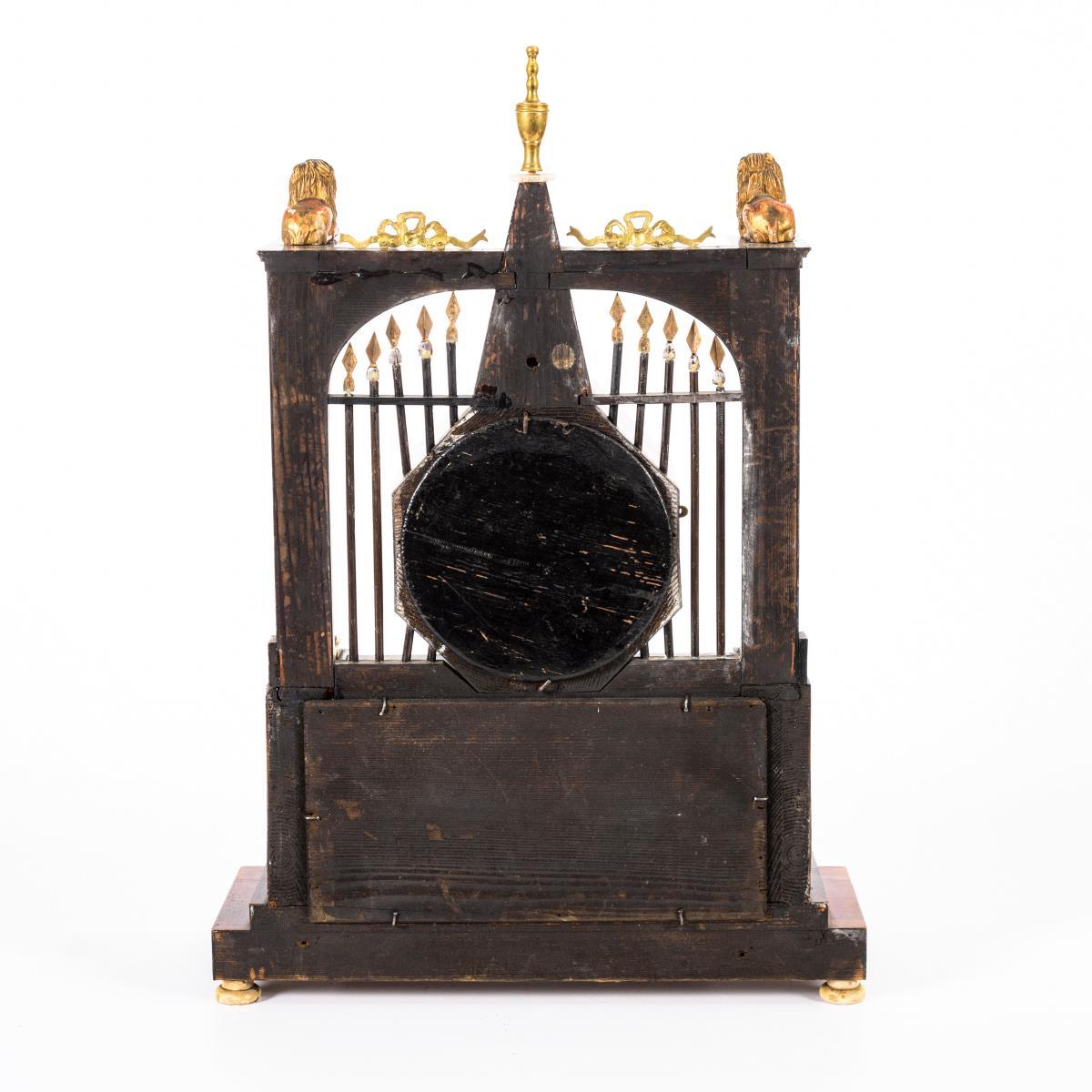 Architektonisch gestaltete Klassizismus-Uhr mit rückwandigem Lanzengitter, oktogonaler Uhrentrommel mit pyramidalem Abschluss, Rundbögen, Säulen und Zierbeschlägen mit floralen und figürlichen Motiven, zweifarbig furnierter Boden mit Schrägbändern. Gehwerk läuft an, revisionsbedürftig. Alt restauriert. Mit Defekten und fehlenden Elementen (z.B. Rückwandverspieglung, Ziffernglas), Alters- und Gebrauchsspuren.