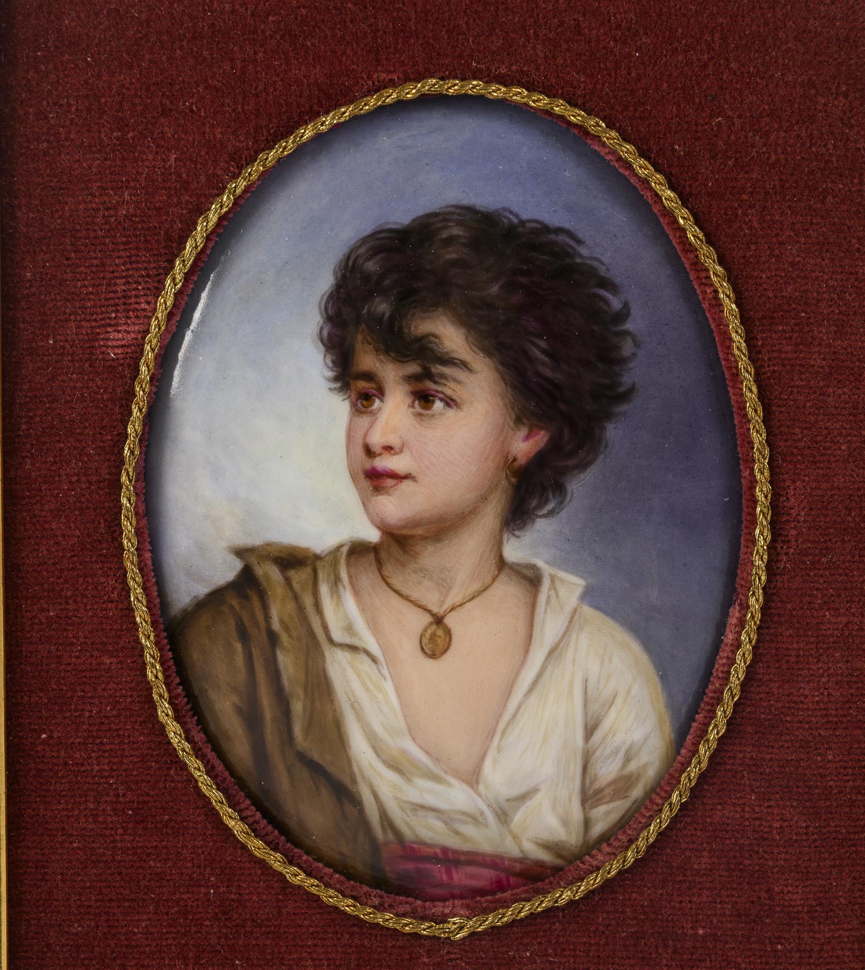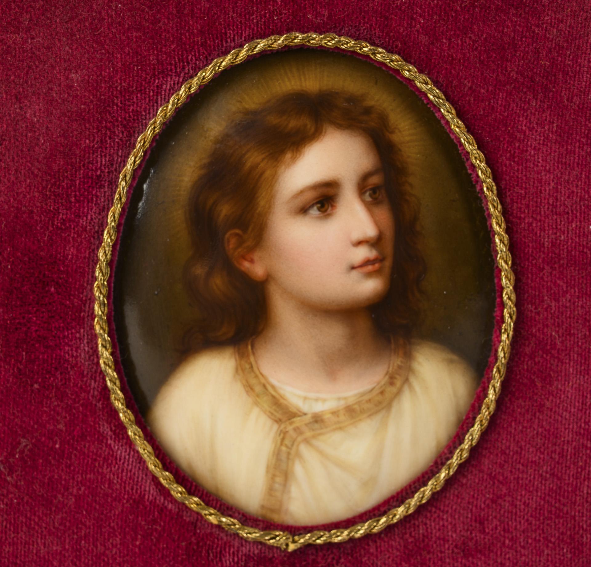 1x ovale Plakette mit dem Porträt eines italienischen Fischerknaben nach einem Gemälde von Gustav K. L. Richter (1823-1884). L 12 cm, im goldbronzierten Holzrahmen (30 x 25 cm). / 1x ovale Plakette mit der Darstellung des Jesusknaben nach Heinrich Hofmann (1824-1911). L 8,5 cm, im Holzrahmen (24,5 x 22 cm).