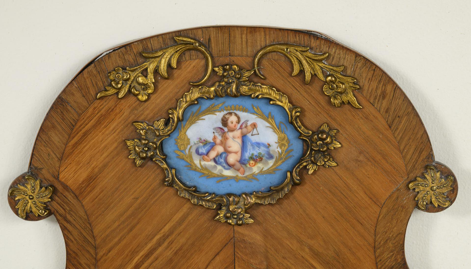 Geschweiftes Wandboard mit 3 halbrunden Ablageflächen und Rundsäulenstützen, rocaillierte Konsolstützen. Spiegel- und viertelfurnierte Flächen, florale Bronzebeschläge und -Zapfen, im Giebel und Konsole je eine ovale Porzellanplakette mit farbiger Putten- und Blumenmalerei. Leichte Alters- und Gebrauchsspuren, leichte Furnierrisse und Wasserschäden, Beschläge teils etwas gelockert.