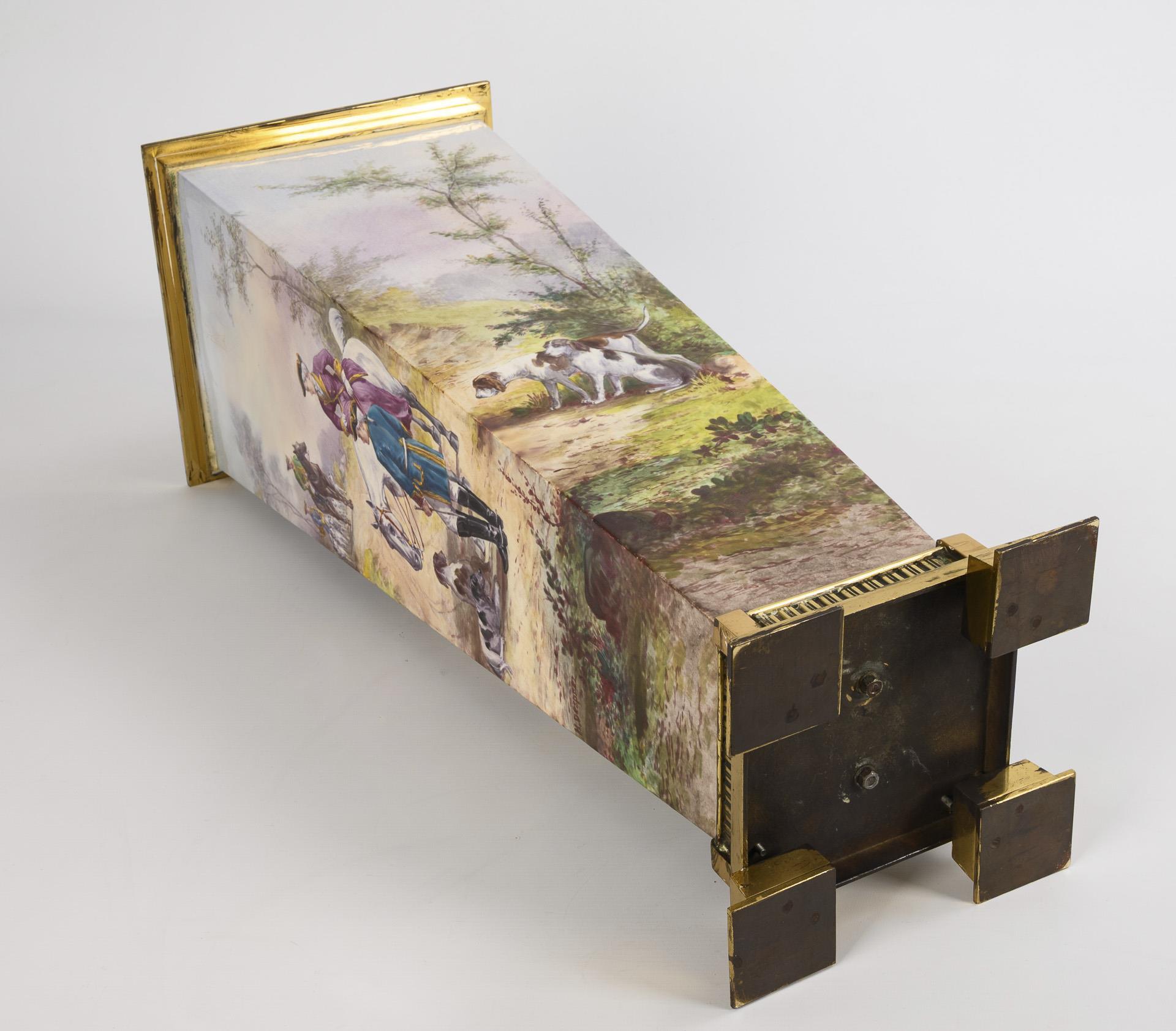 Landschaft mit einer barocken Jagdgesellschaft bei einer Parforcejagd. Alters- und Gebrauchsspuren am Metall.