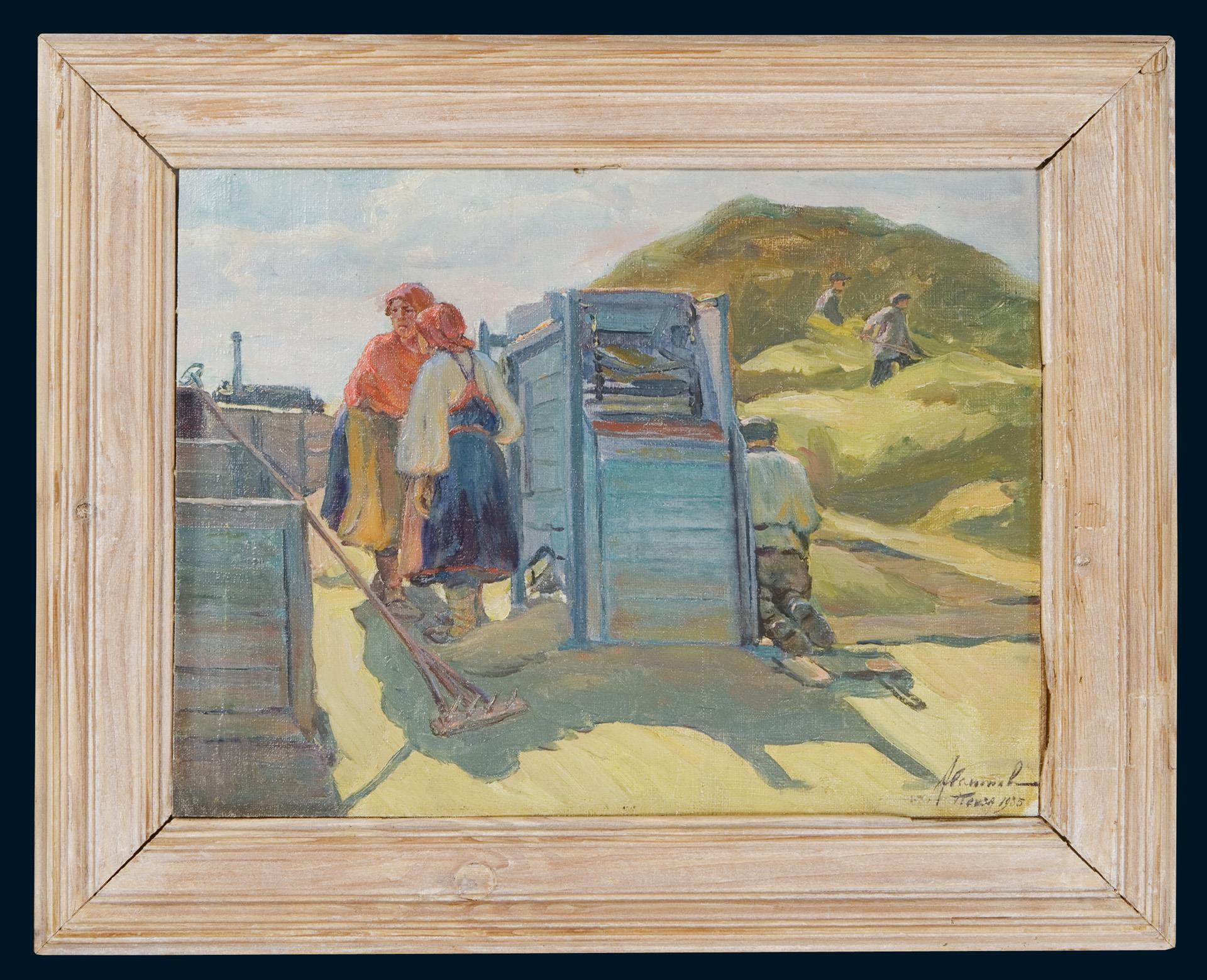 Szene aus dem ländlichen Arbeitsalltag in hellem Kolorit. Einfacher Profilrahmen.