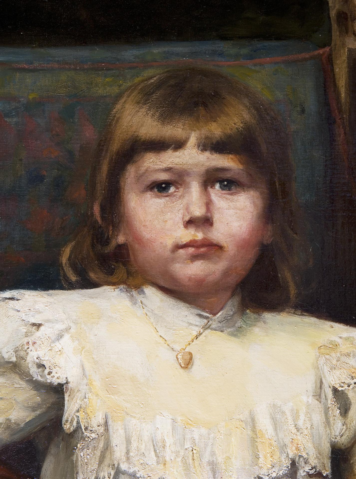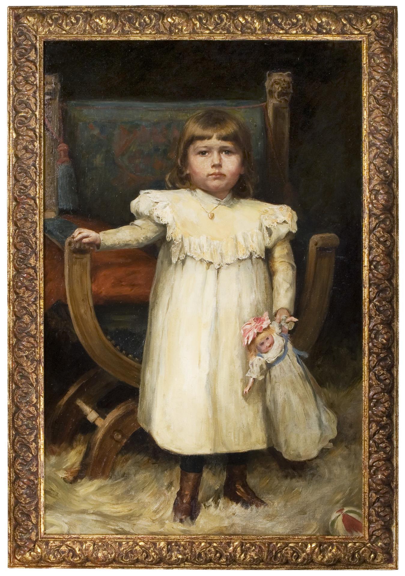 Großformatiges Standbildnis, vermutlich eine Autragsarbeit. Dem Maler ist es gelungen, bei allem kindlichen Liebreiz den spezifischen Charakter auf uns wirken zu lassen. Vergoldeter Stuckrahmen. Doubliert.
