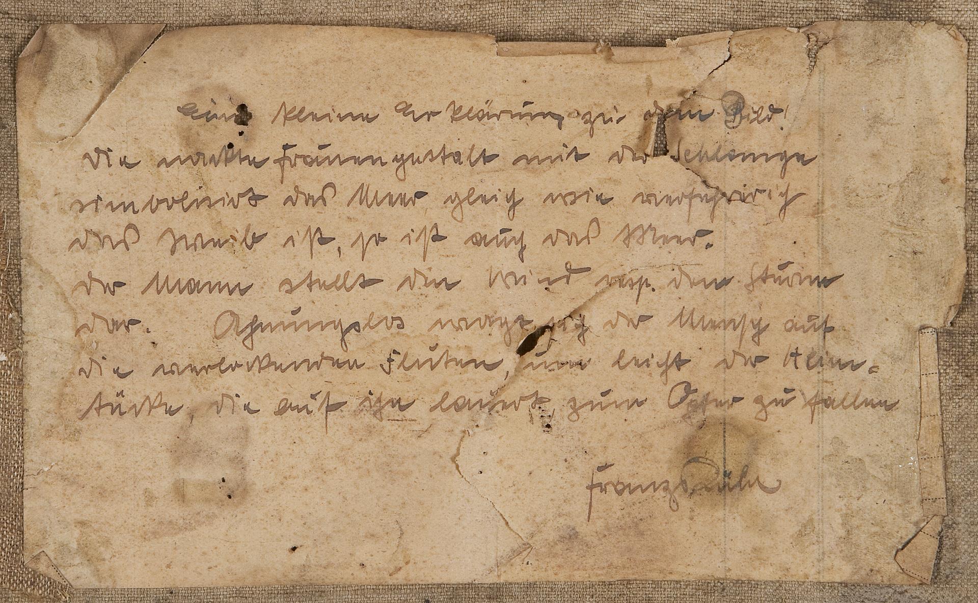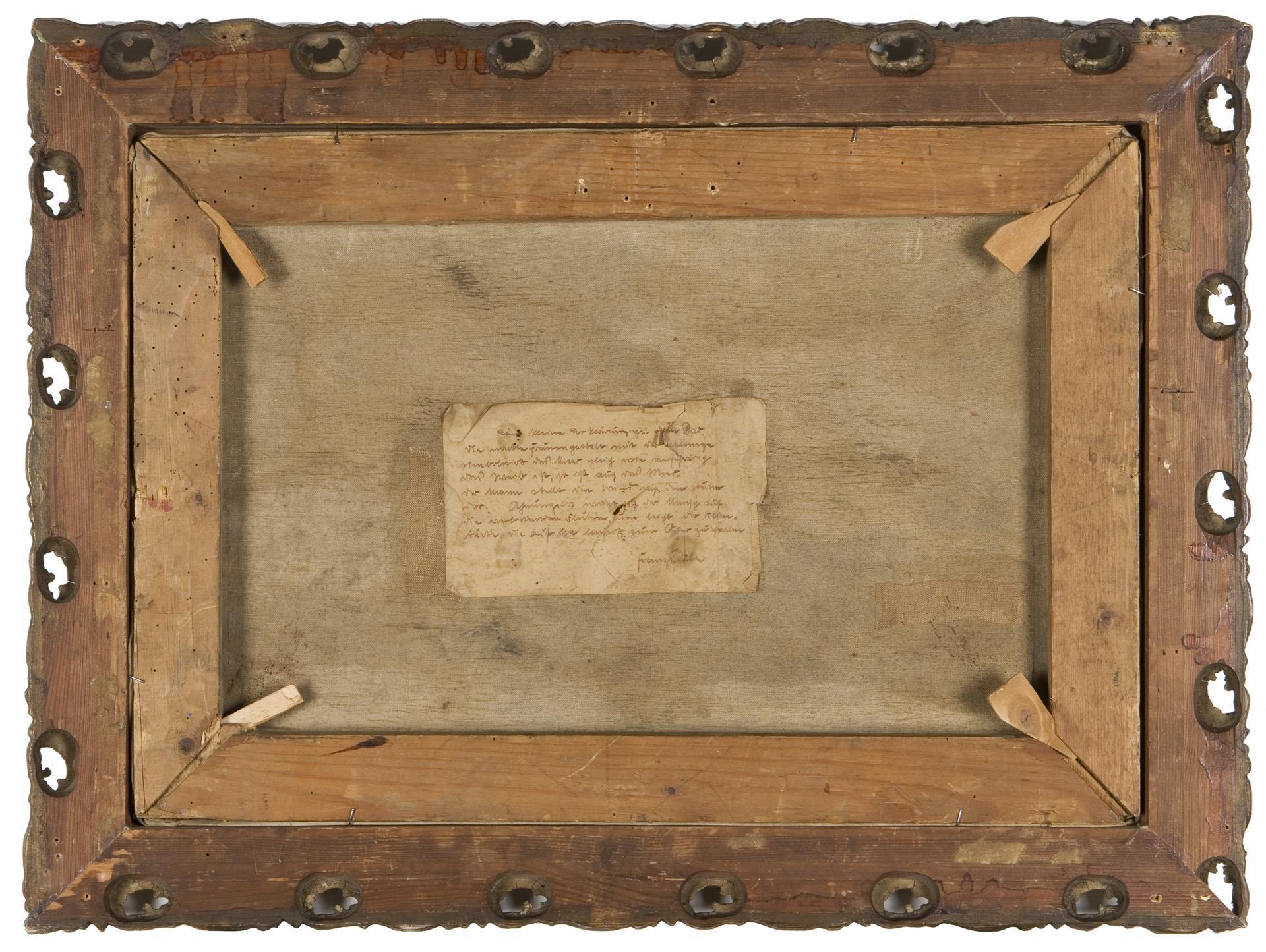 Das Original-Gemälde in der Neuen Pinakothek in München (105 x 194 cm). Rückseitig Motivbeschreibung auf altem Klebezettel. Durchbrochen gearbeiteter Stuckrahmen. Rückseitig zwei Flicken.