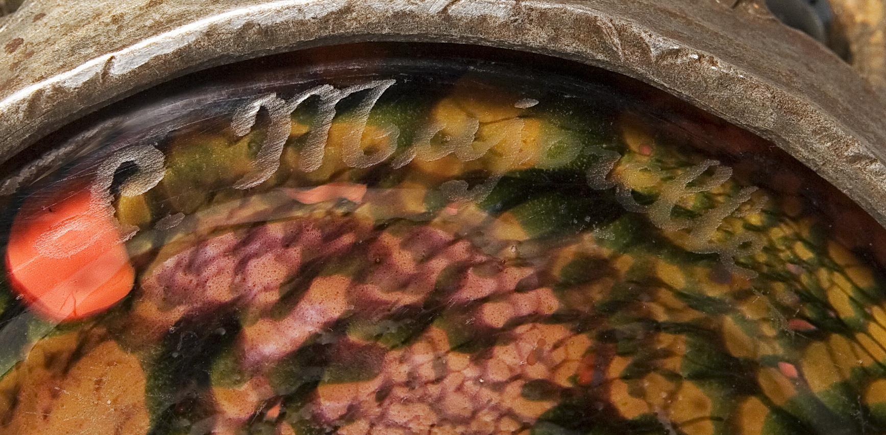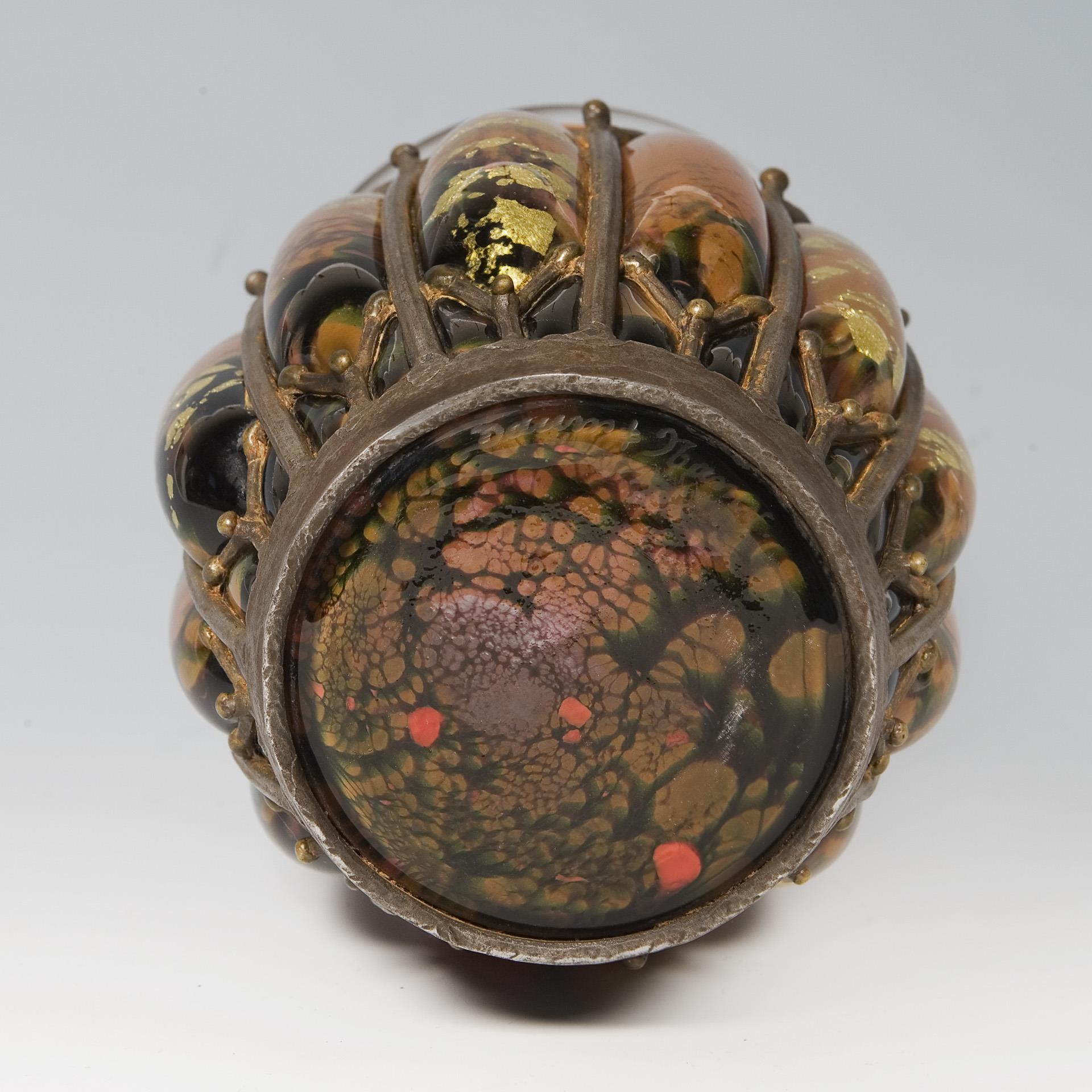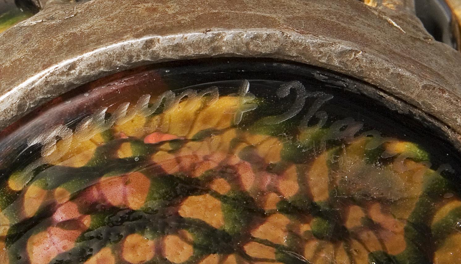 Farbloses dickwandiges Glas mit orangefarbenen, braun-grünen Pulvereinschmelzungen und Goldfolie in eine ornamental reliefierte Eisenfassung geblasen. Ätzsignatur Daum Nancy mit Lothringer Kreuz und L. Majorelle.