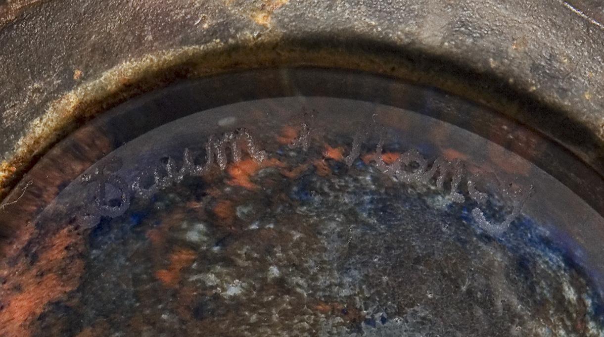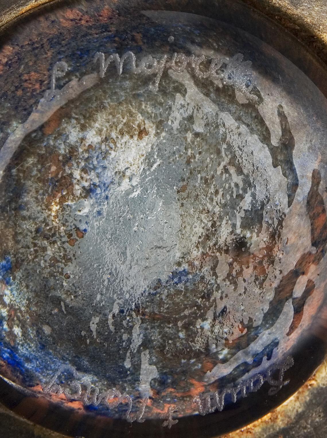 Farbloses dickwandiges Glas mit hellblauen, azurblauen und rotbraunen Pulvereinschmelzungen in eine Eisenfassung geblasen. Ätzsignatur Daum Nancy mit Lothringer Kreuz und L. Majorelle.