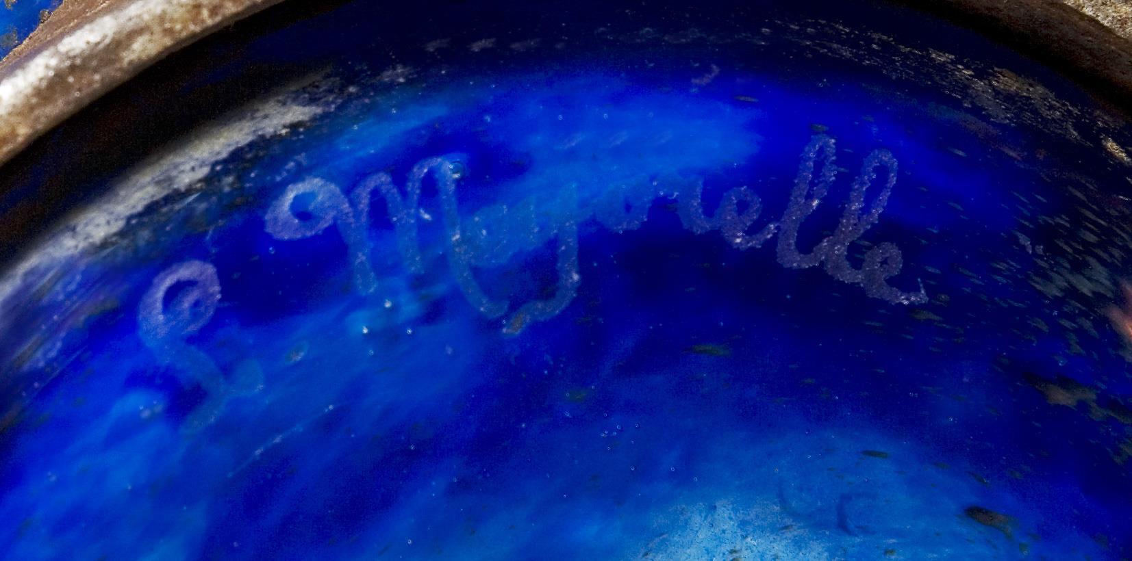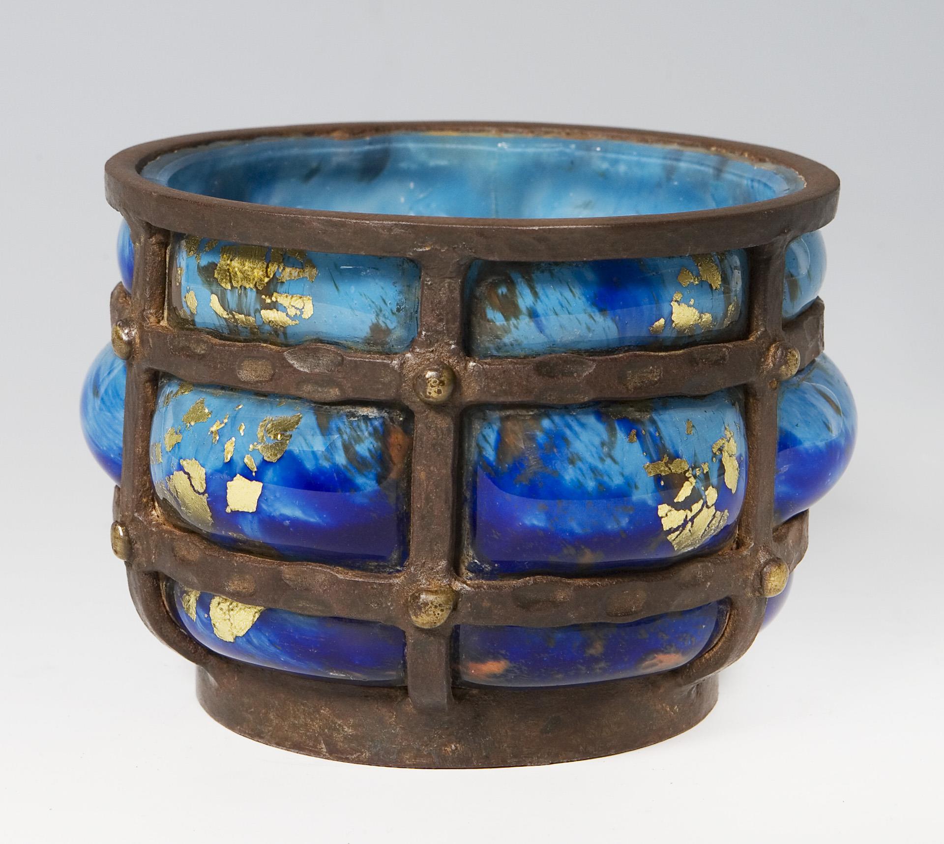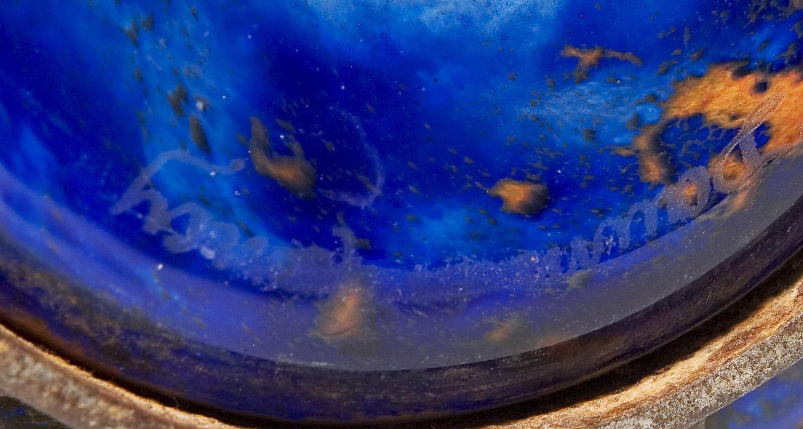Farbloses dickwandiges Glas mit hellblauen und azurblauen Pulvereinschmelzungen und Goldfolie in eine Eisenfassung geblasen. Ätzsignatur Daum Nancy mit Lothringer Kreuz und L. Majorelle. Innenboden mit Gebrauchsspuren.