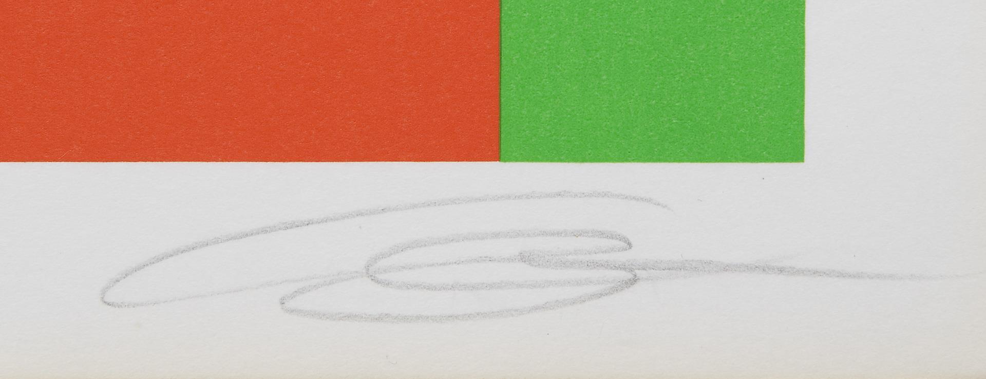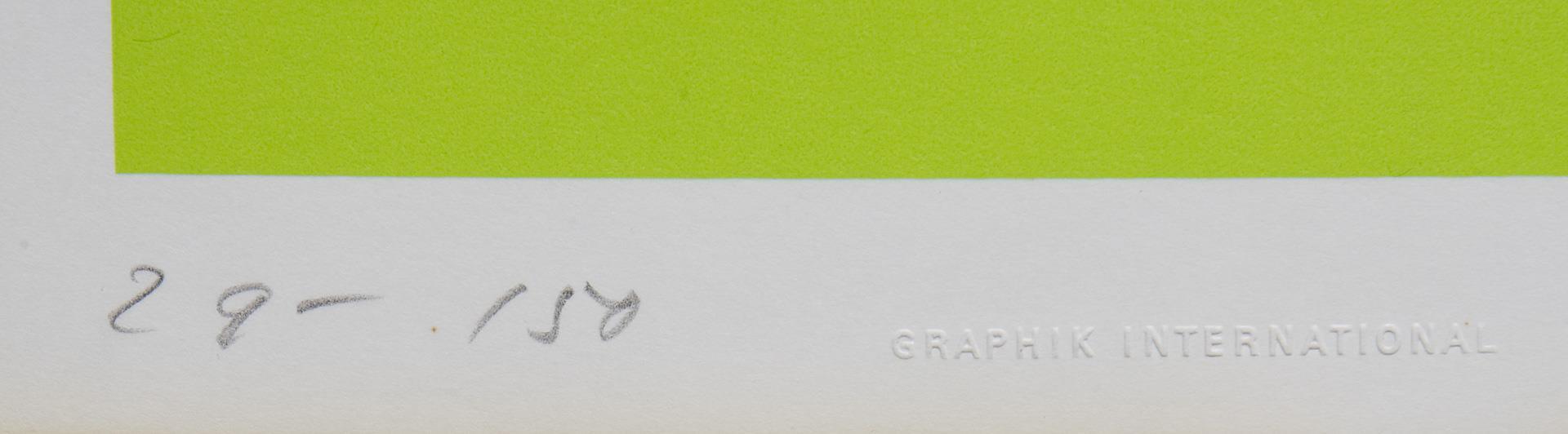 In lückenlosen Rechteckflächen kommt das Zusammenspiel von Form und Farbe zum Ausdruck. Farbsiebdruck, nummeriert: 29/150, Prägestempel: Graphik International. Ohne Passepartout, Rahmen. Blattkanten verschmutzt.