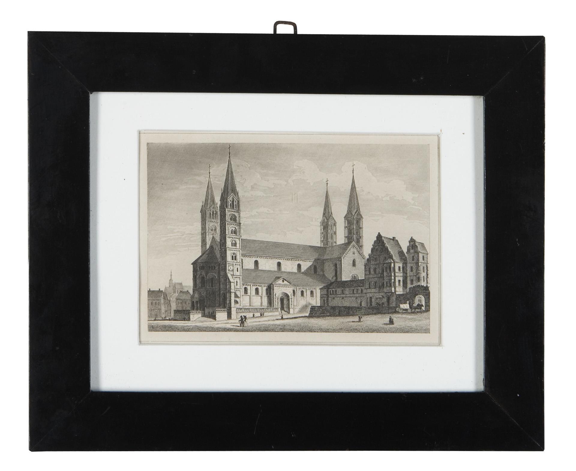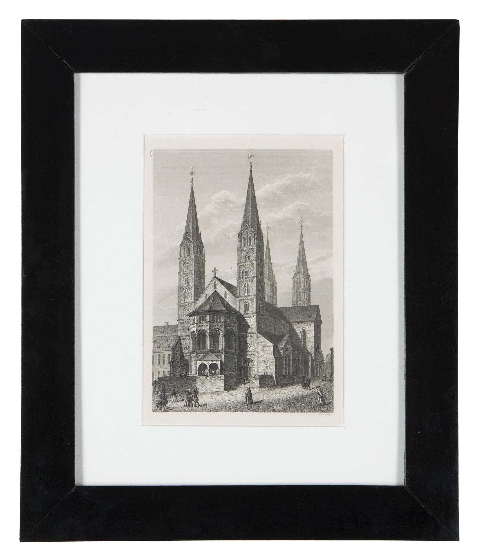 Eine Görlitz-Lithographie, Ansicht mit Kaisertrutz und Reichenbacher Turm. Zwei Bamberg-Stahlstiche, Der Hohe Sankt Peter und Sankt Georg zu Bamberg, kurz Bamberger Dom: eine Ansicht mit Ostfassade, eine Ansicht mit Dom und Alte Hofhaltung. Passepartout, verglaste geschwärzte Biedermeier-Rahmen mit Holzrückwand.