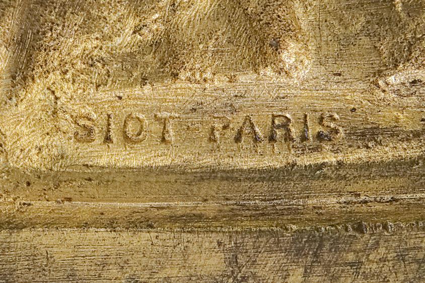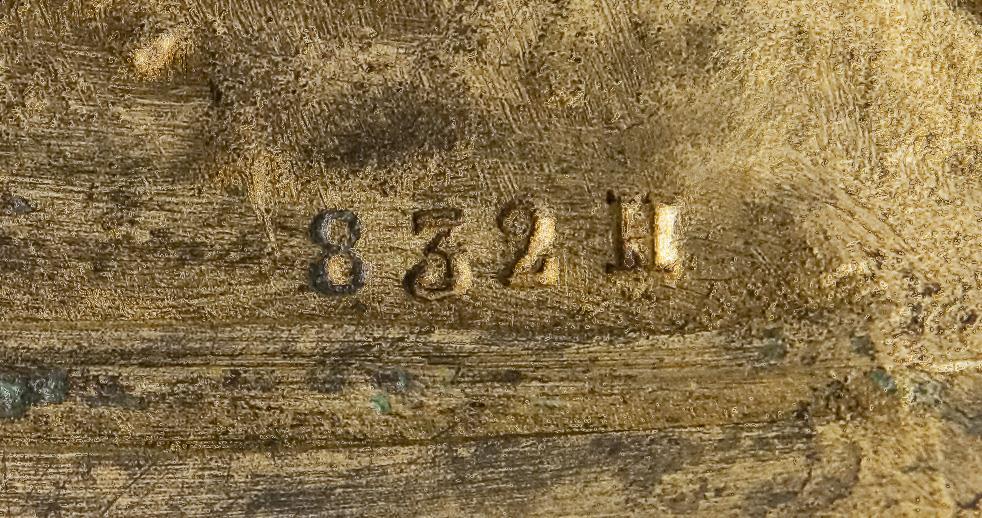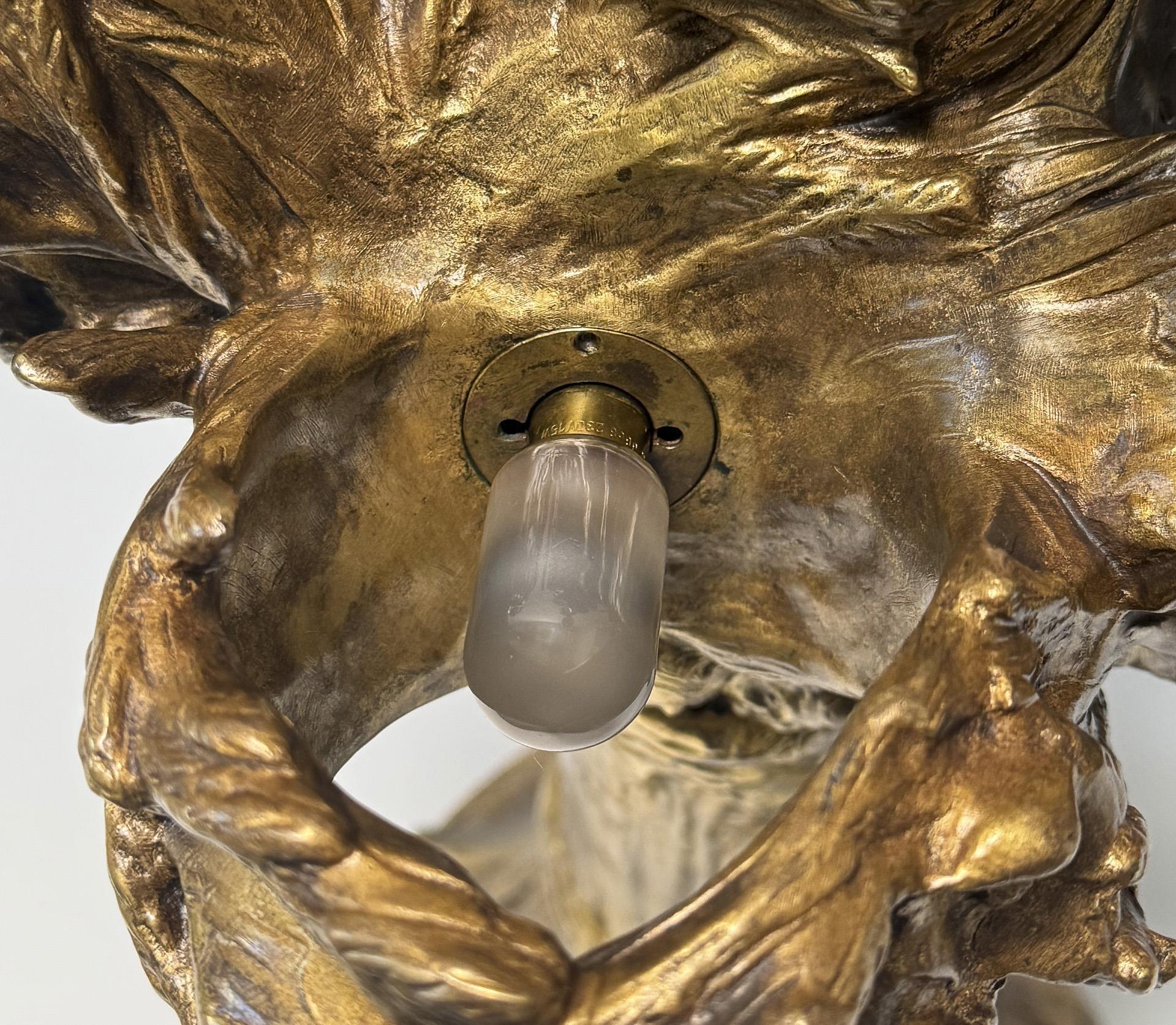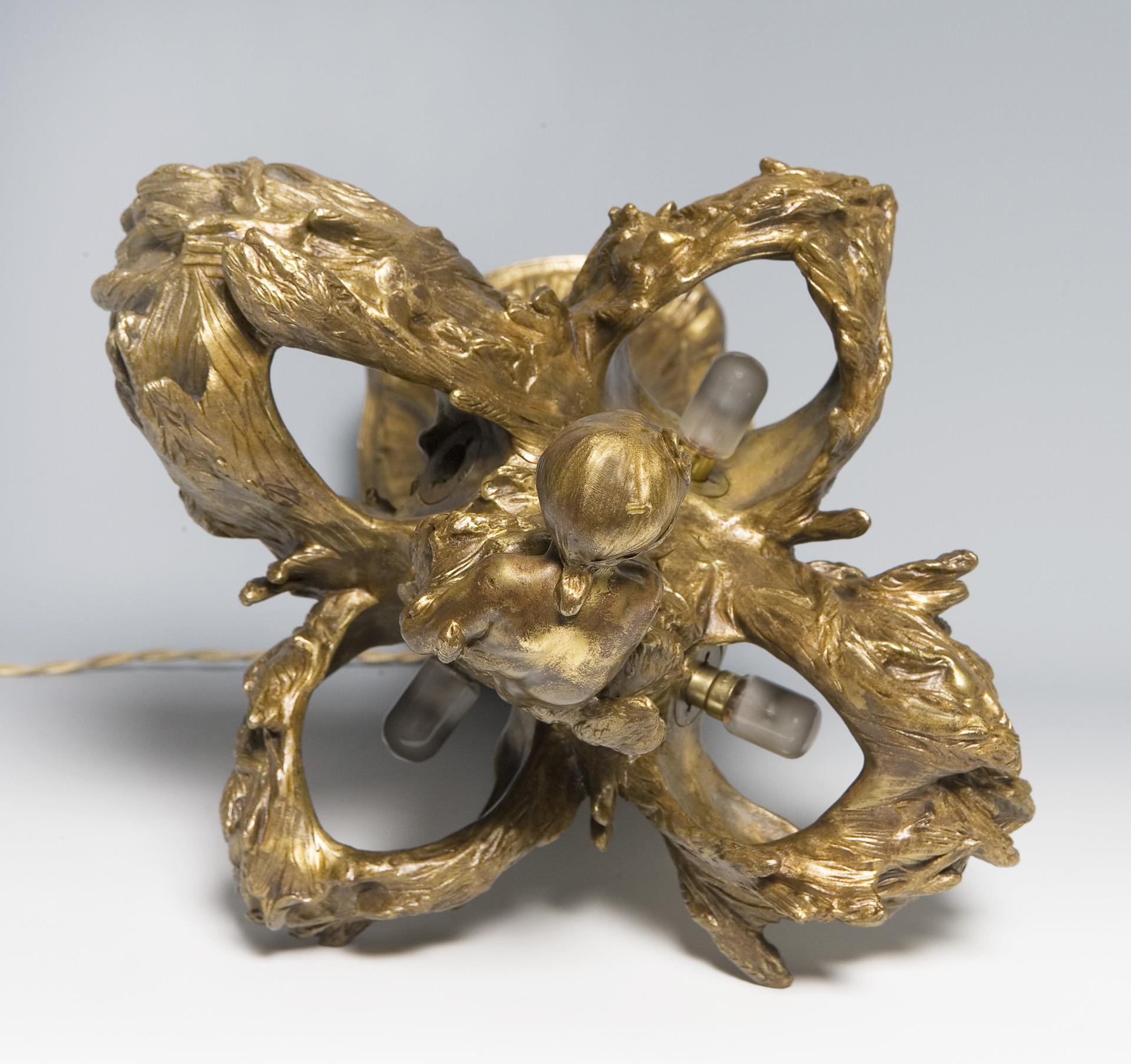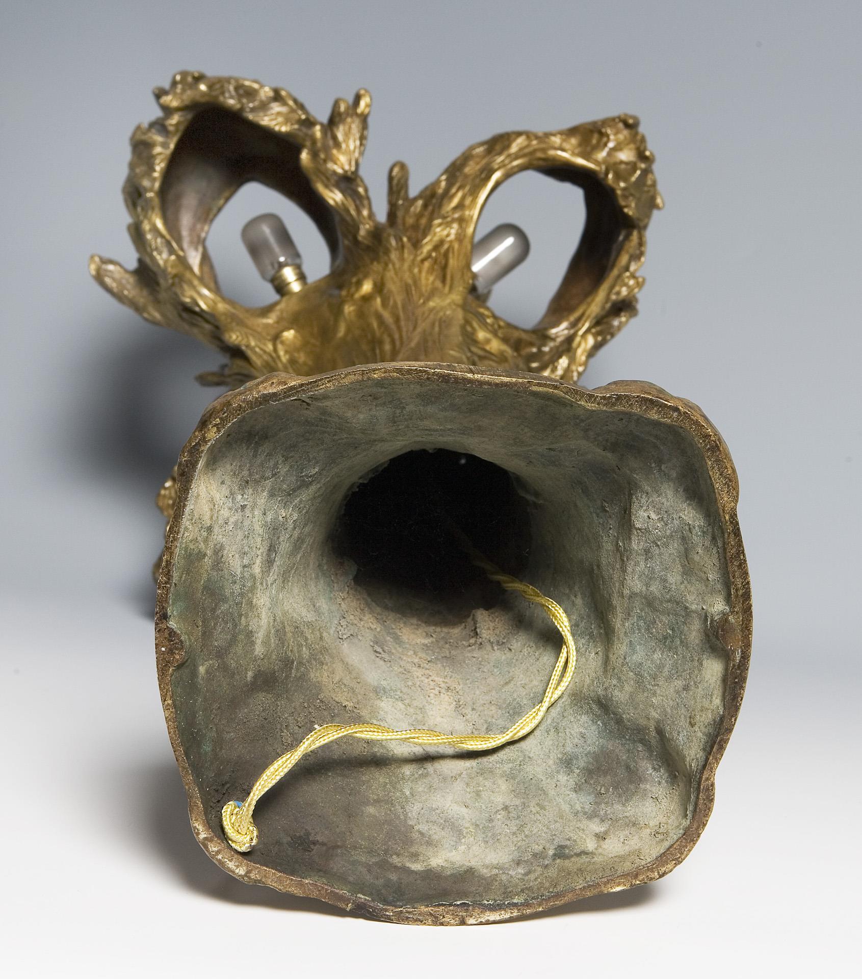 Künstler-Signet, Gießerstempel: Siot Paris, nummeriert: 832 II. Alt elektrifiziert, vier Lichtquellen mit drei Glühlampen. Am Standfuß partiell kleine Oxidationsflecken.