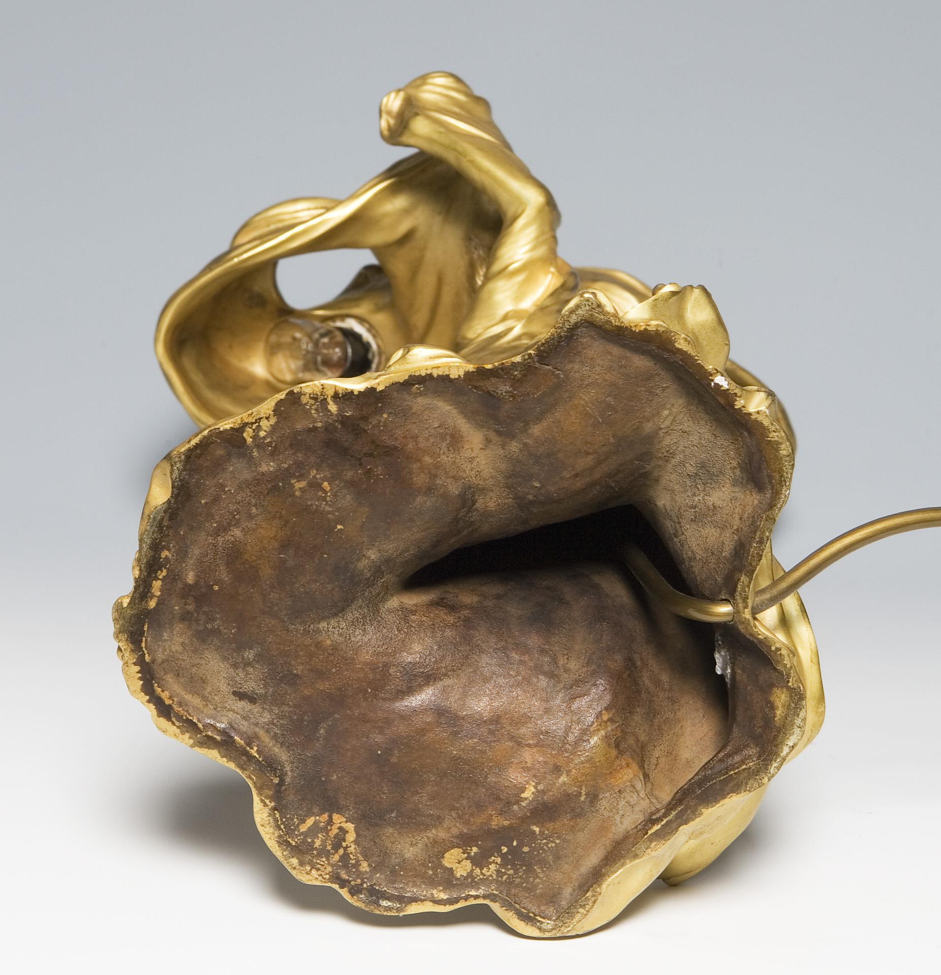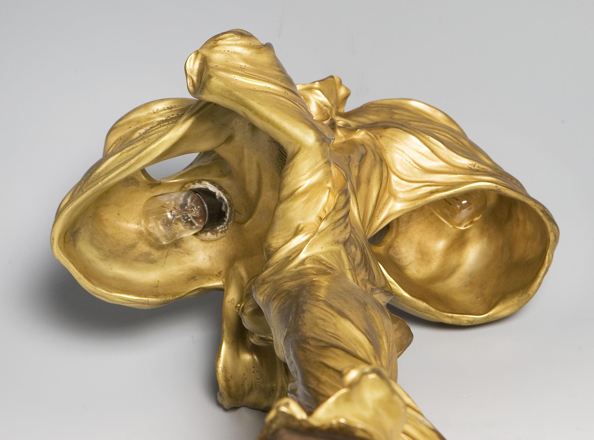 Künstler-Signet, Gießerstempel: Siot Decauville Fondeur Paris, nummeriert: J 144. Elektrifiziert, zwei Lichtquellen. Loie Fuller, alias Marie Louise Fuller (1862-1928) war die erste Tänzerin, die elektrisches Licht bei ihren Schleiertänzen einsetzte. Partiell leicht berieben.