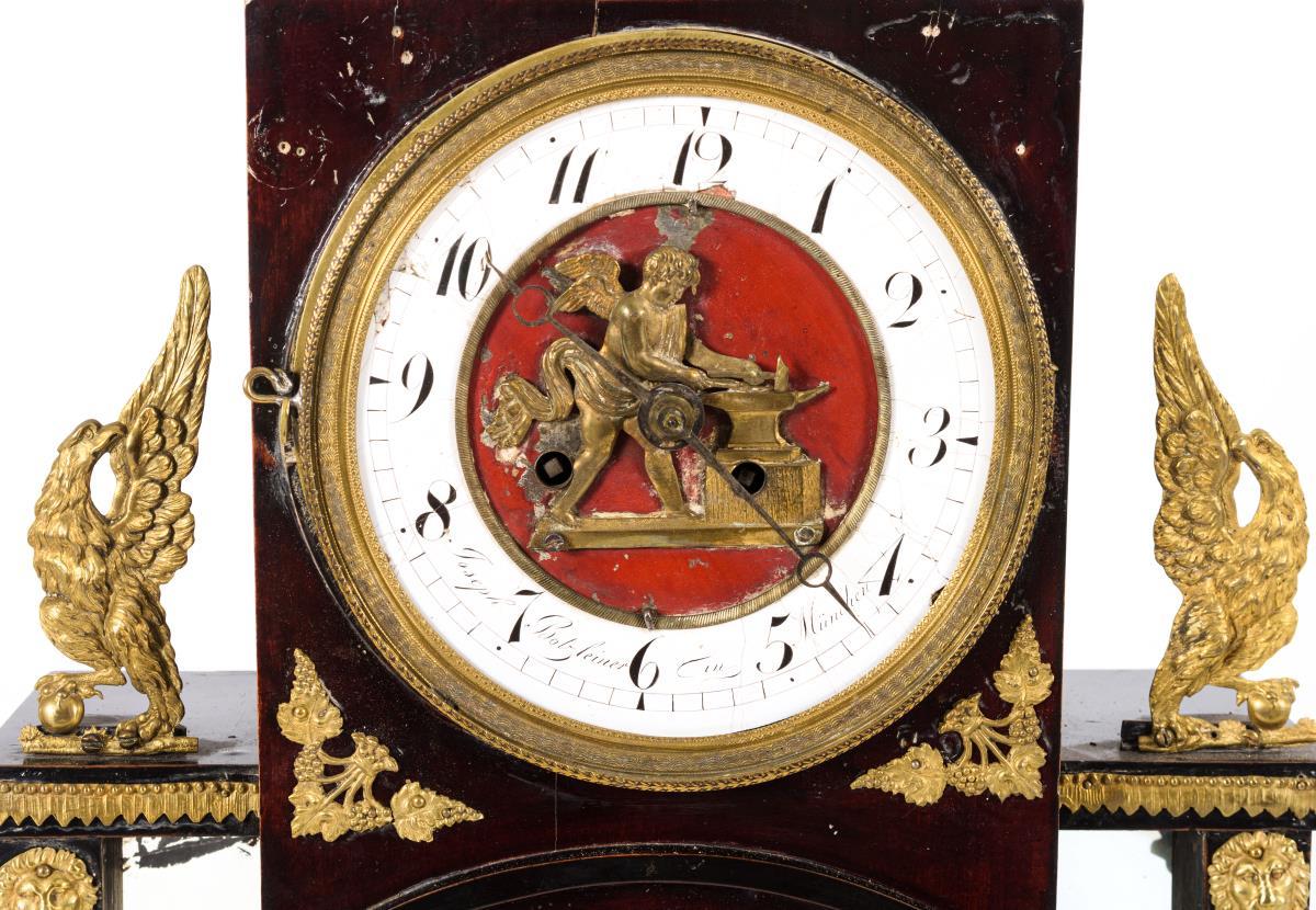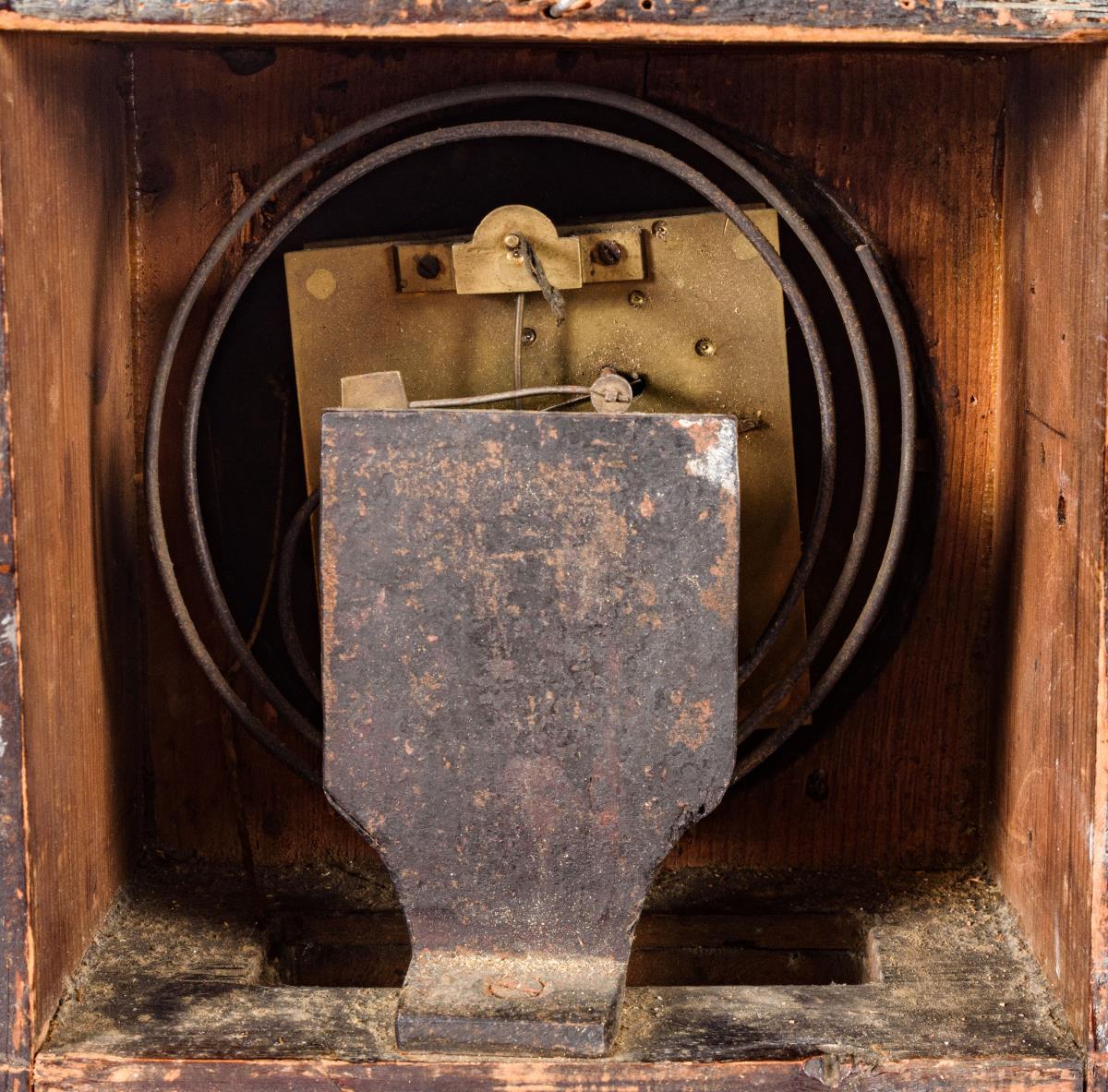 Portaluhr mit 4 Säulen und verspiegelter Rückwand sowie rechteckigem Uhrengiebel mit kleinem Rundbogenabschluss und Zierbeschlägen. Seitlich jeweils ein Adler, Sockelboden mit floralem Schablonendekor. Läuft, revisionsbedürftig. Alt restauriert. Mit Defekten, Fehlstellen, Alters- und Gebrauchsspuren.