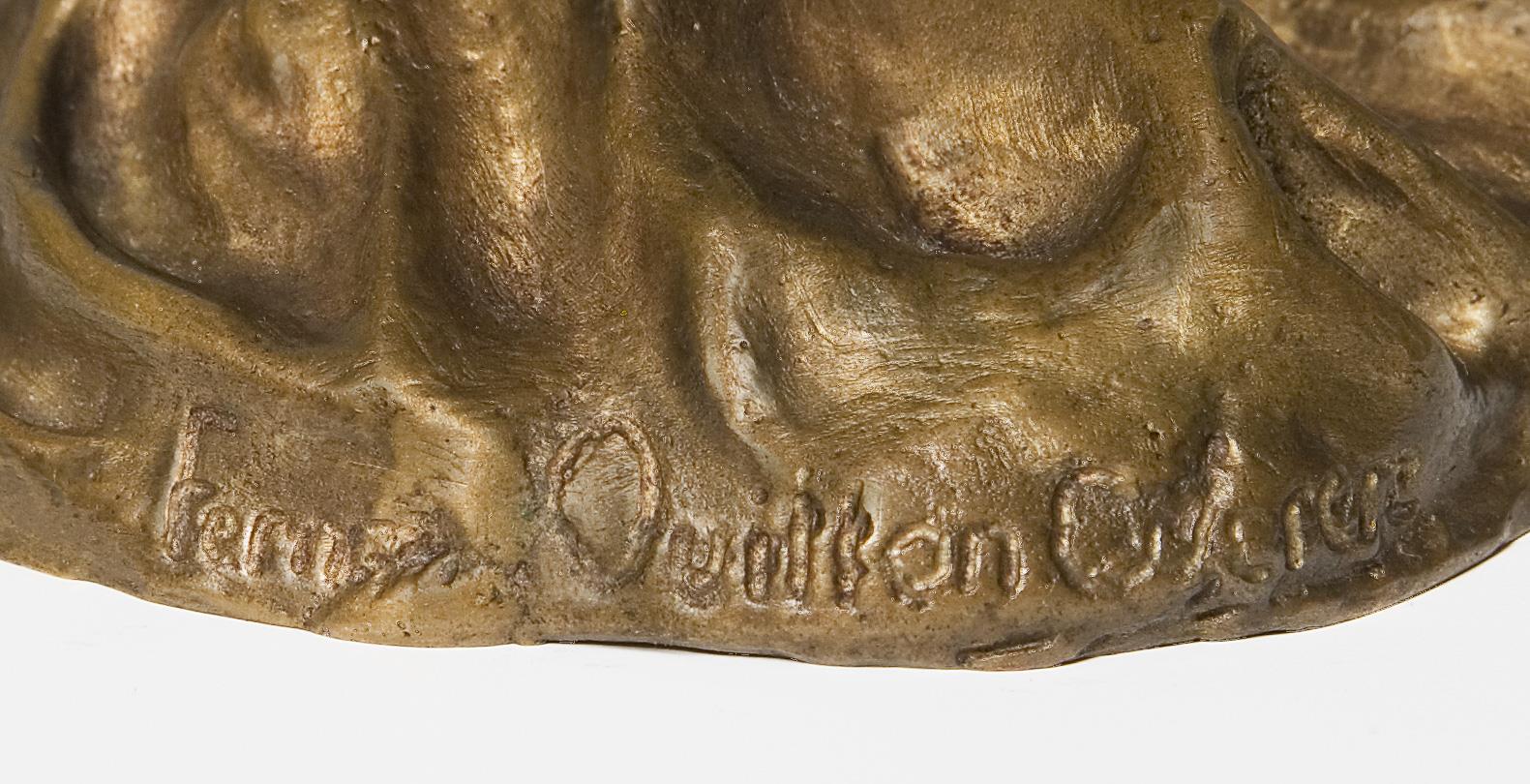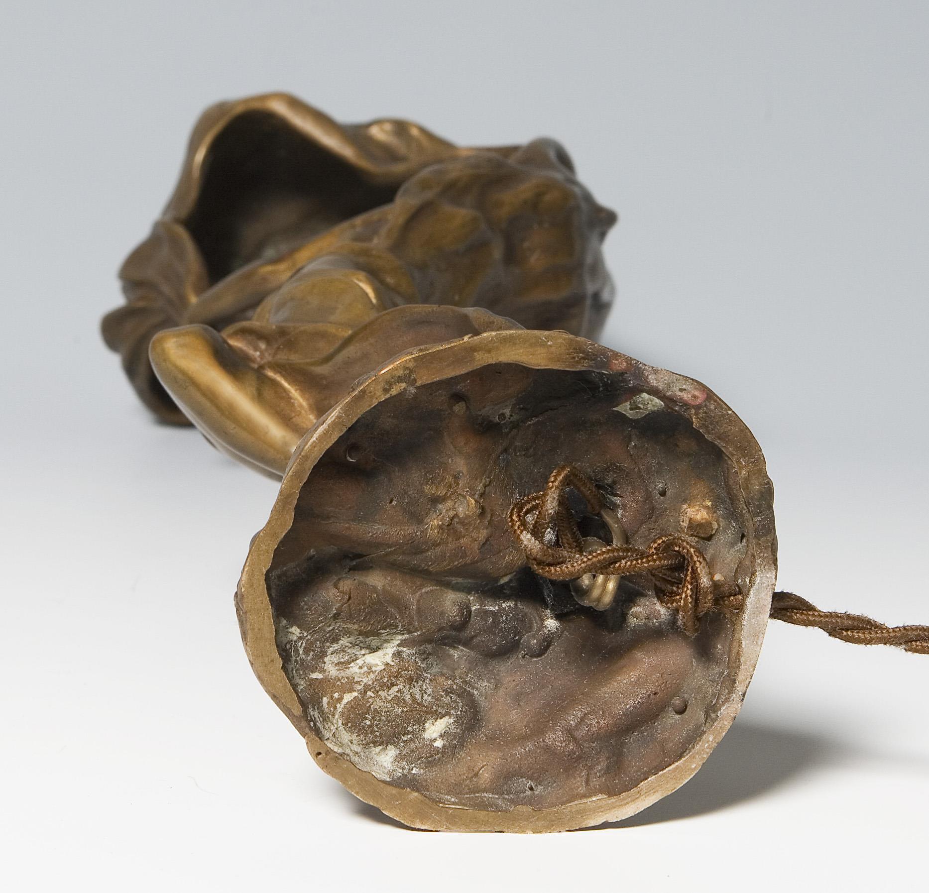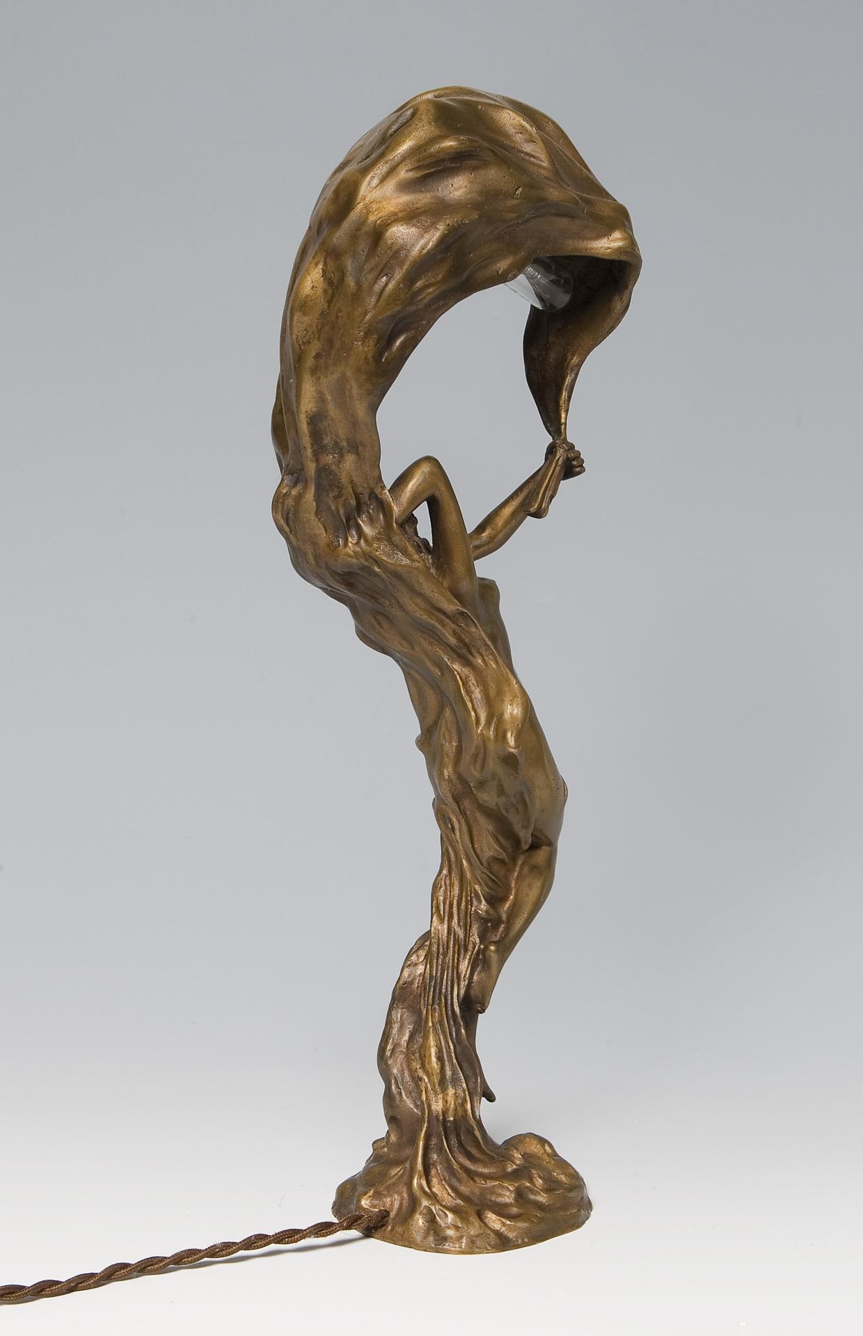 Künstler-Signet, alt elektrifiziert, eine Lichtquelle. Für die Figur wurde der Künstler, wie so viele andere Bildhauer, von der Tänzerin Loie Fuller, alias Marie Louise Fuller (1862-1928) inspiriert, sie war die erste Tänzerin, die elektrisches Licht bei ihren Schleiertänzen einsetzte. Patina partiell oxidiert.