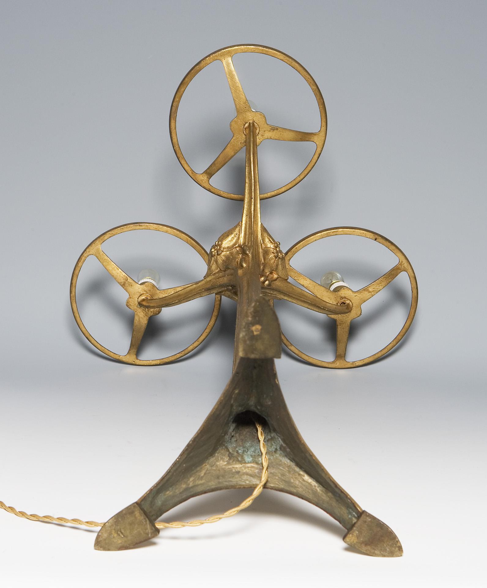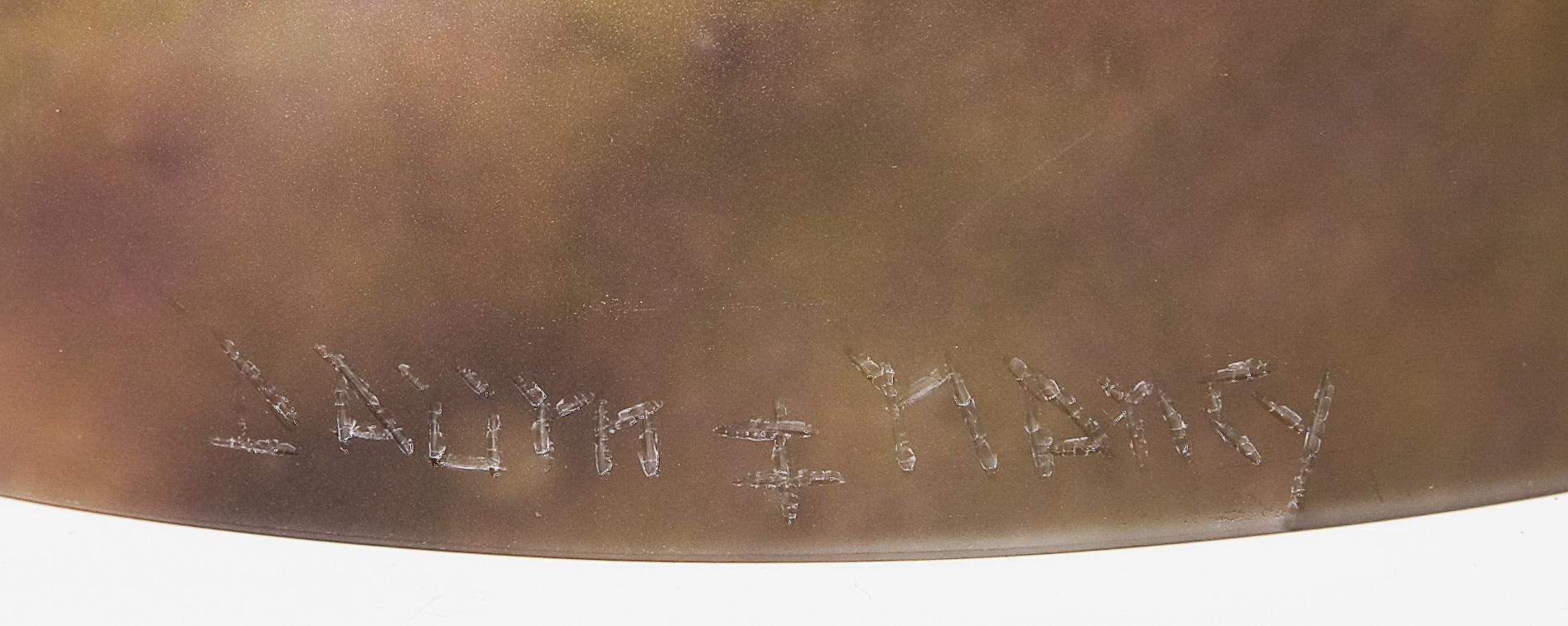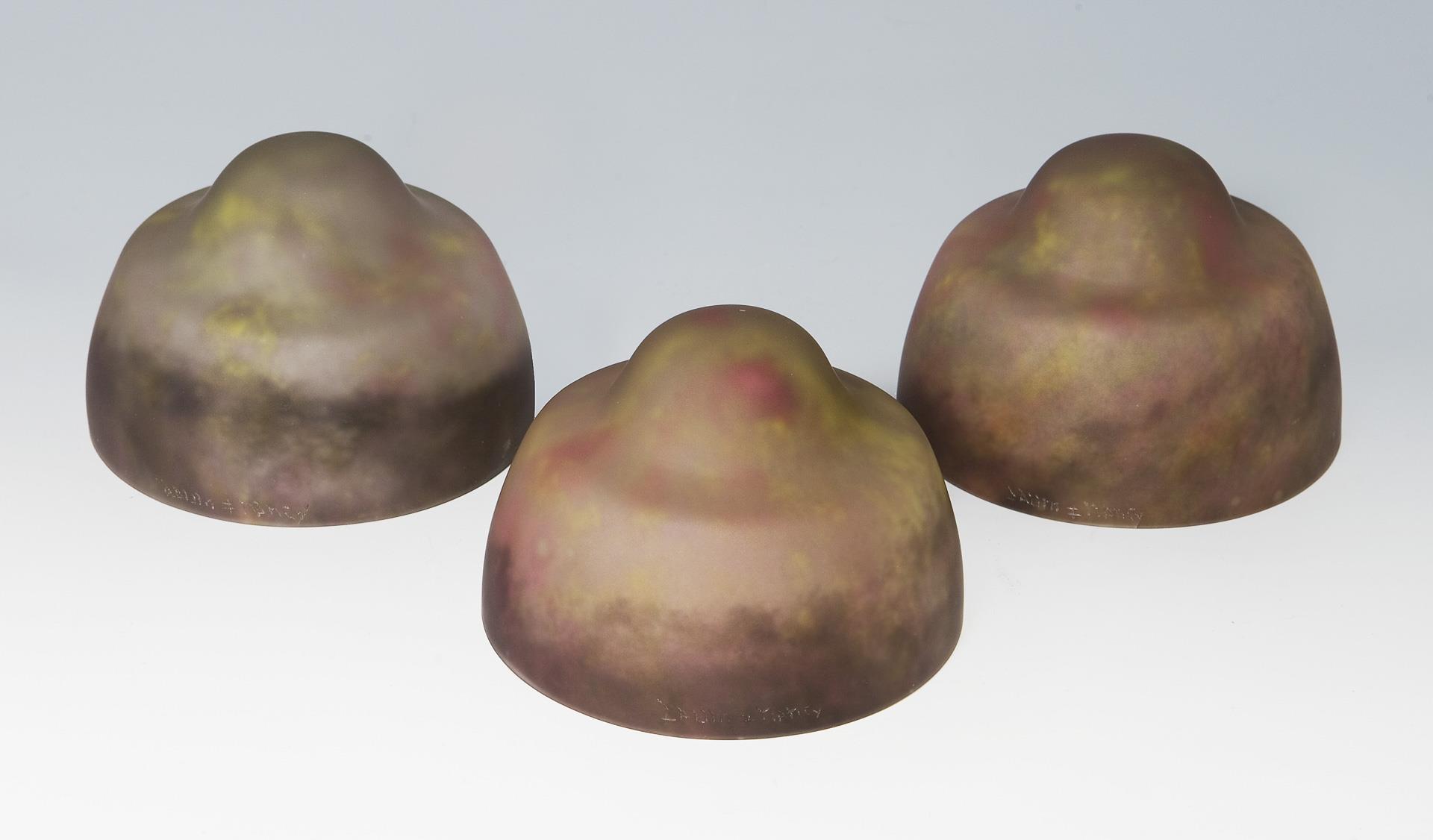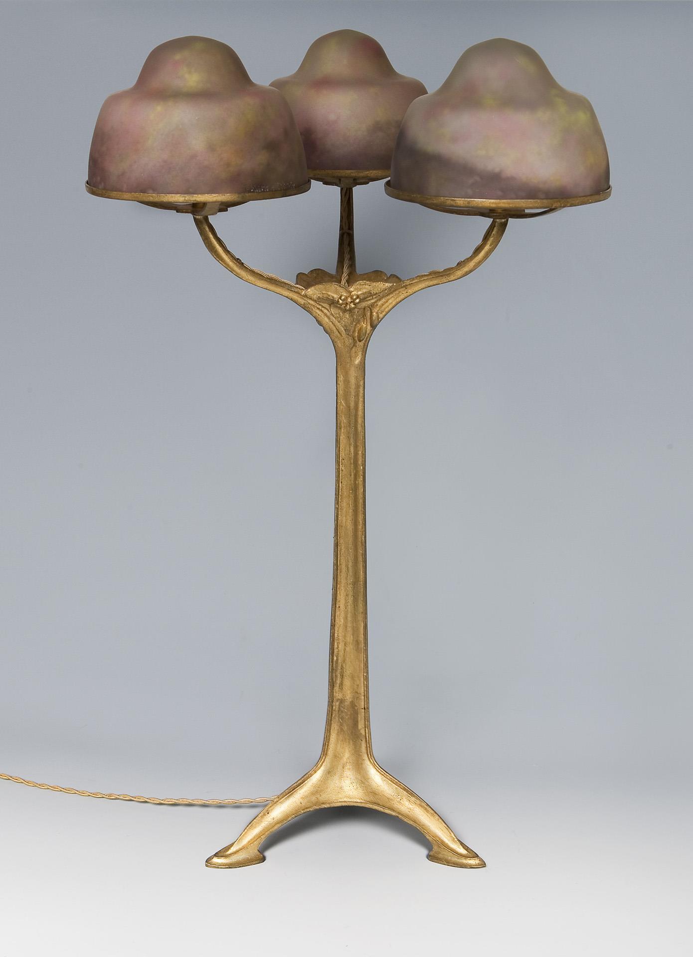 Ehemals vergoldeter Bronzefuß mit reliefiertem floralem Dekor und 3-armiger Schirmhalterung. Schirme aus dickwandigem farblosem mattiertem Glas mit Pulvereinschmelzungen in Violett, Gelb und Grün. Geschnittene Signaturen Daum Nancy mit Lothringer Kreuz, alt elektrifiziert, drei Lichtquellen. Ein Schirm am Rand minimal bestoßen, minimale Kratzer.