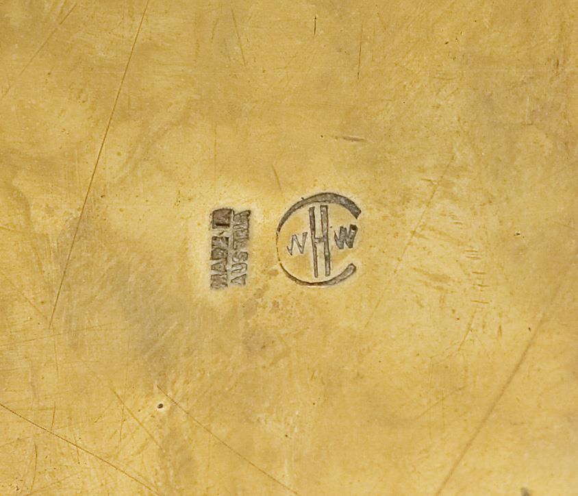 2 Aschenbecher mit Hammerschlagdekor, 1 Zigarettenbecher mit figürlicher Handhabe, 1 kleines ovales Tablett, 1 Döschen mit figürlichem Knauf. Firmenmarken WHW im Kreis, "Made in Austria". Gebrauchsspuren.