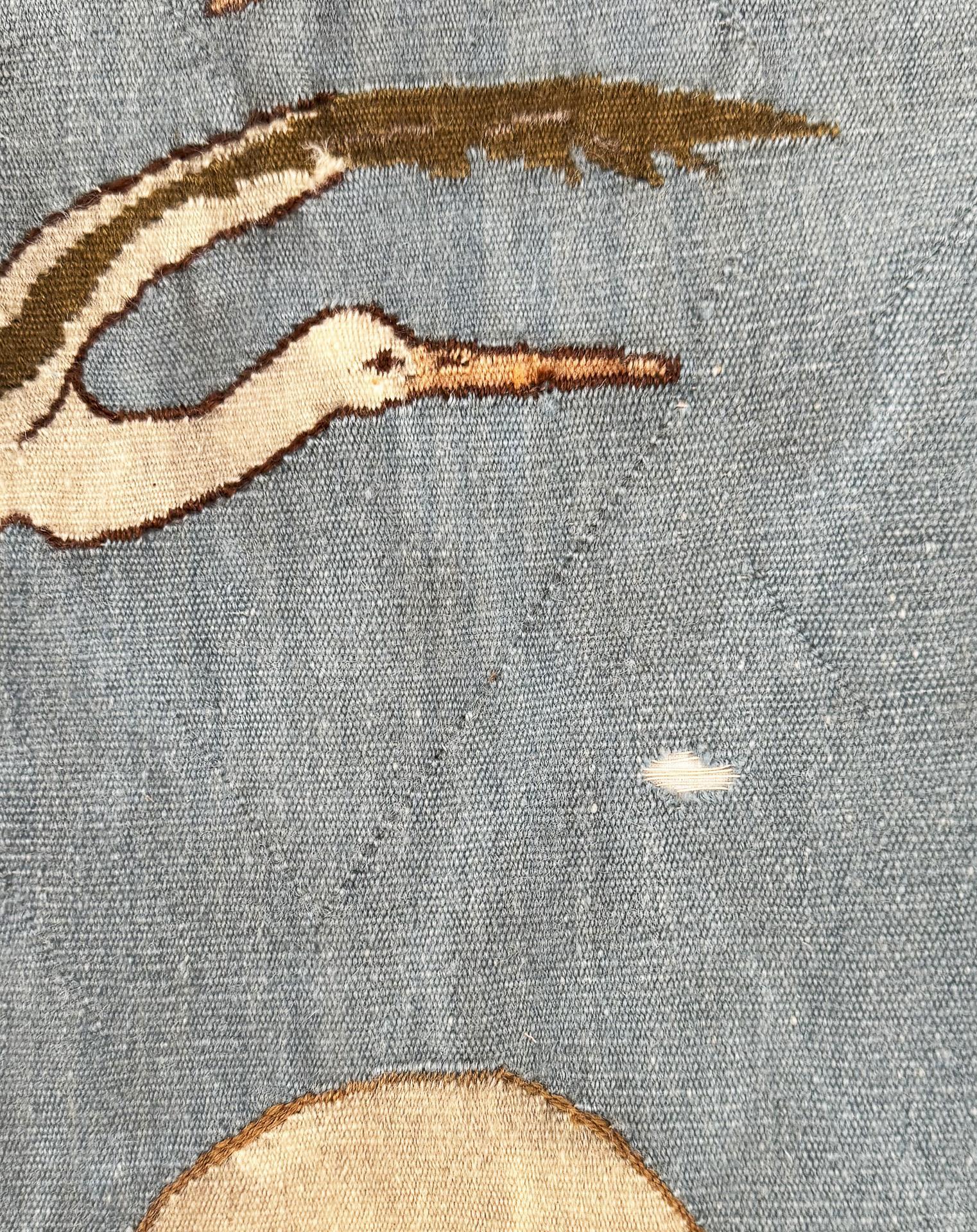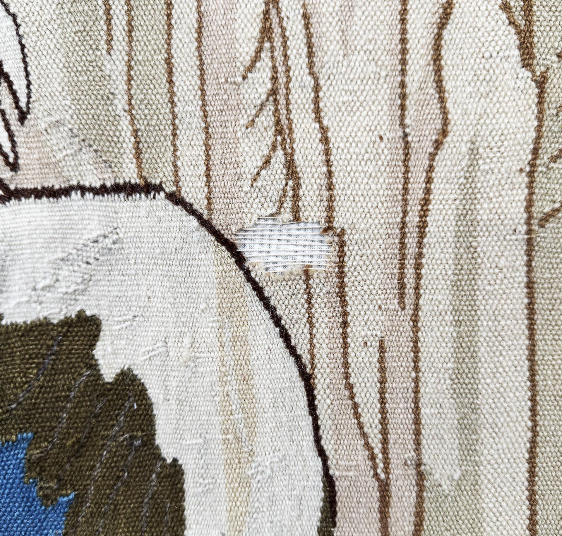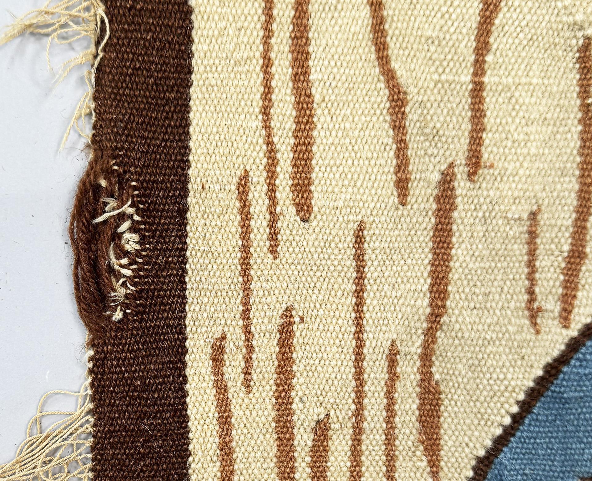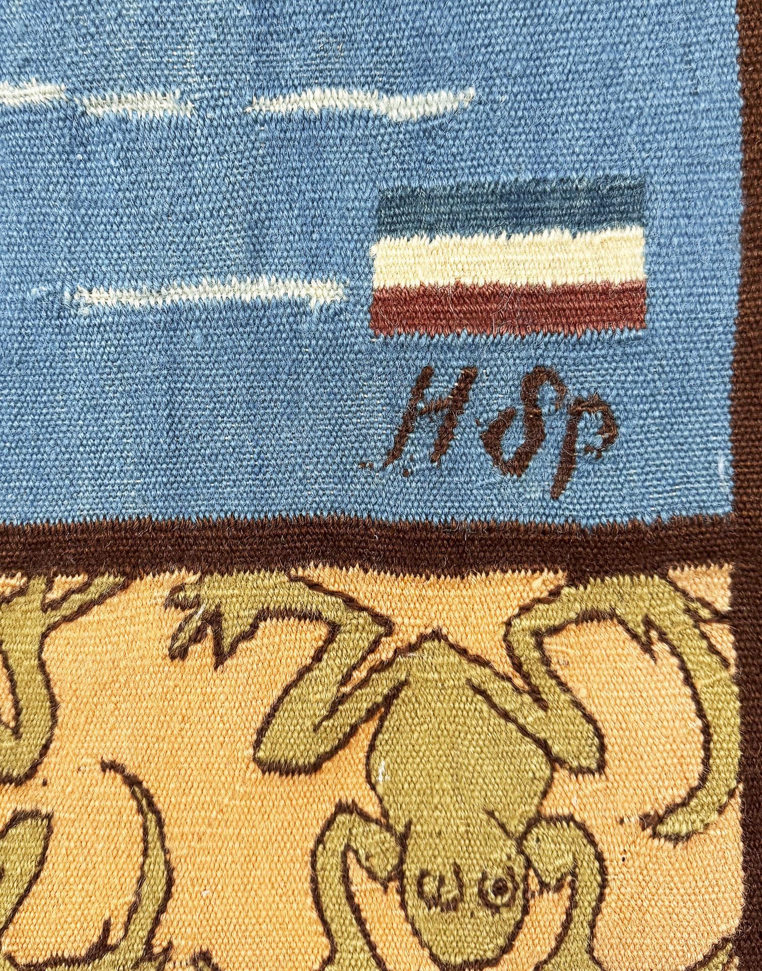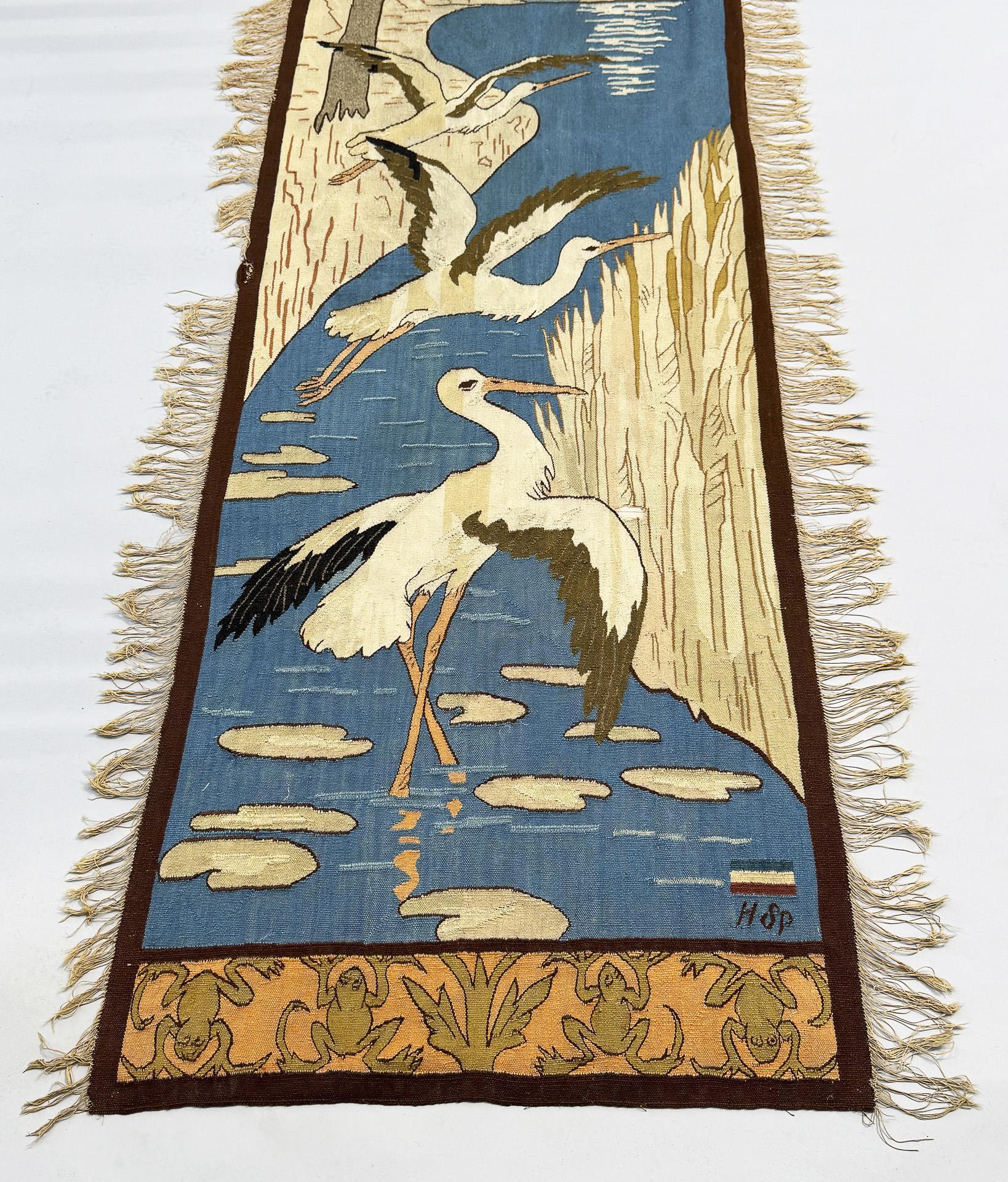 Mit Künstlermonogramm und Webzeichen der Scherrebeker Webschule, seitlicher Fransenbehang. Scherrebek, damals Preußen, heute Dänemark (Skaerbaek). Die 1896 gegründete Kunstwebschule bestand nur kurze Zeit und ging 1903 in Konkurs. Scherrebeker Wandbehänge waren auf allen großen nationalen und internationalen Kunstgewerbe-Ausstellungen vertreten, so auch 1900 auf der Weltausstellung in Paris. Partiell Fehlstellen.