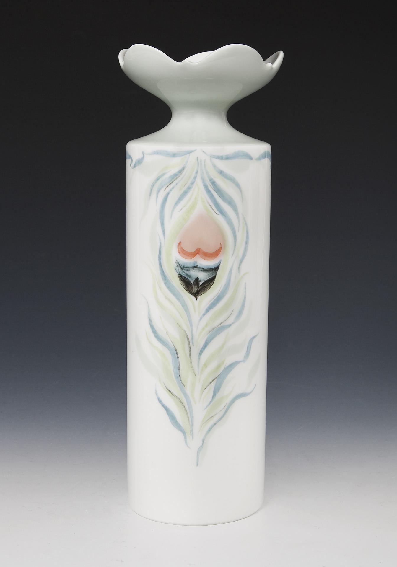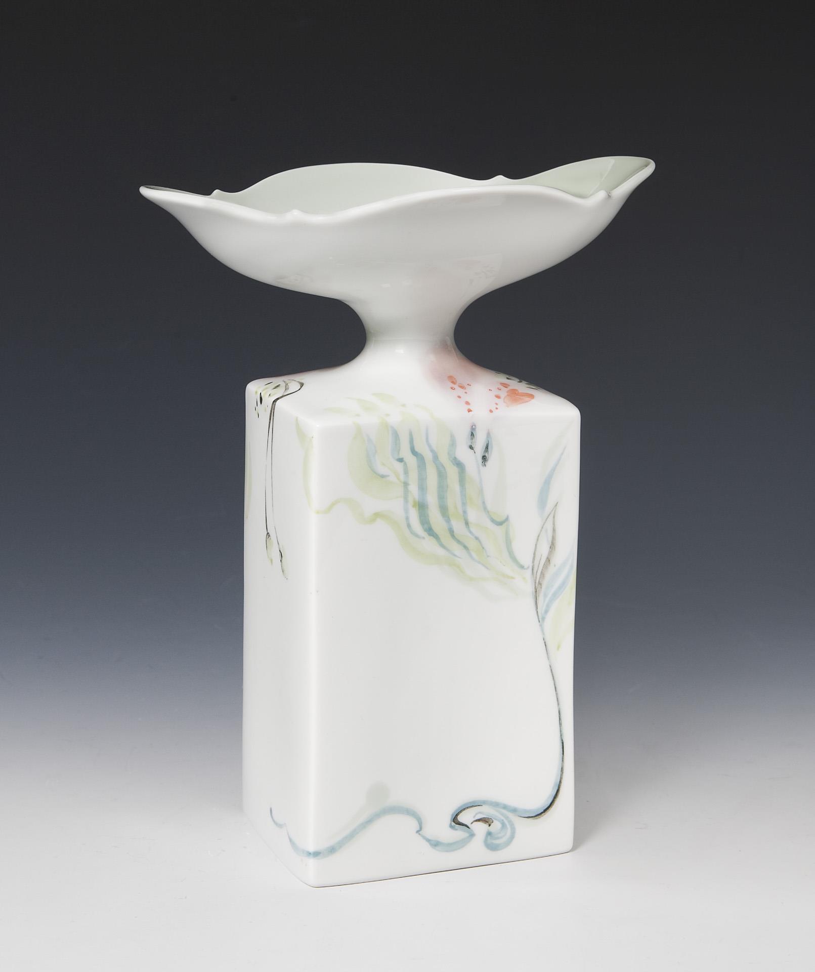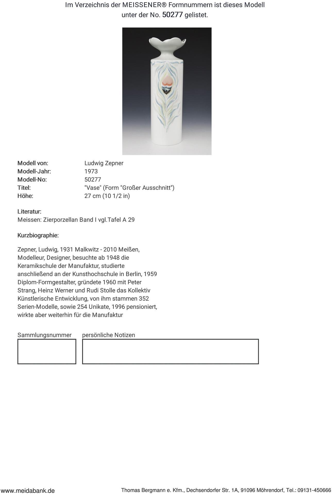 Form "Großer Ausschnitt", Modell von Ludwig Zepner 1973. Dekor Heinz Werner zugeschrieben, eine Dekor-Nr. 875101. Partiell seladongrüner Fond, beidseits florale Bemalung in pastellfarbenen Tönen. Pressmarken, Malermarken, Schwertermarken, eine Schwertermarke einmal gestrichen.