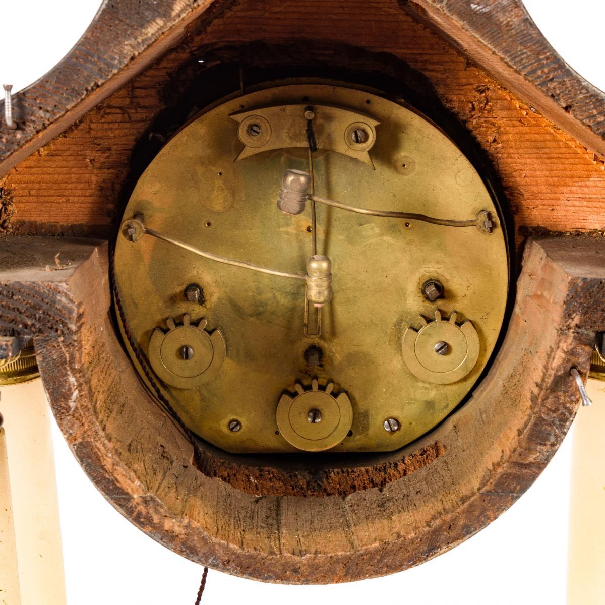 Säulenuhr mit profiliertem Rechtecksockel und gestuft schweiftem Giebelabschluss mit Rosettenbeschlag. Läuft an, revisionsbedürftig. Alt restauriert. Mit Defekten und Gebrauchsspuren, Pendel, Schlüssel und Stundenzeiger fehlen.