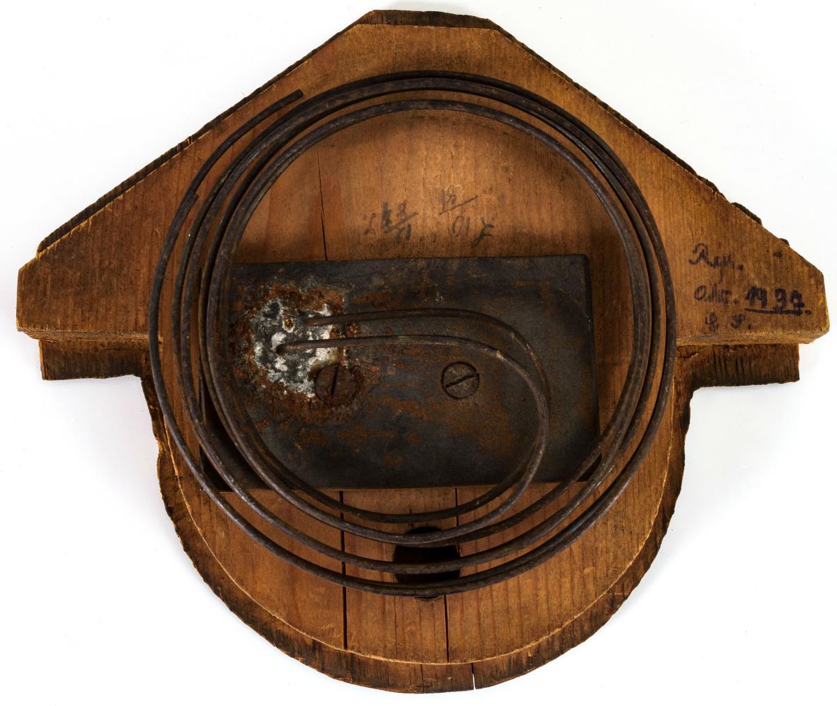 Ungemarktes Werk mit Viertelstundenschlag auf 2 Tonfedern, Fadenaufhängung, Repetition mit Seilzug. Weißer Emailziffernring mit arabischen Zahlen, Minutenkranz und 1 Breguet-Zeiger.