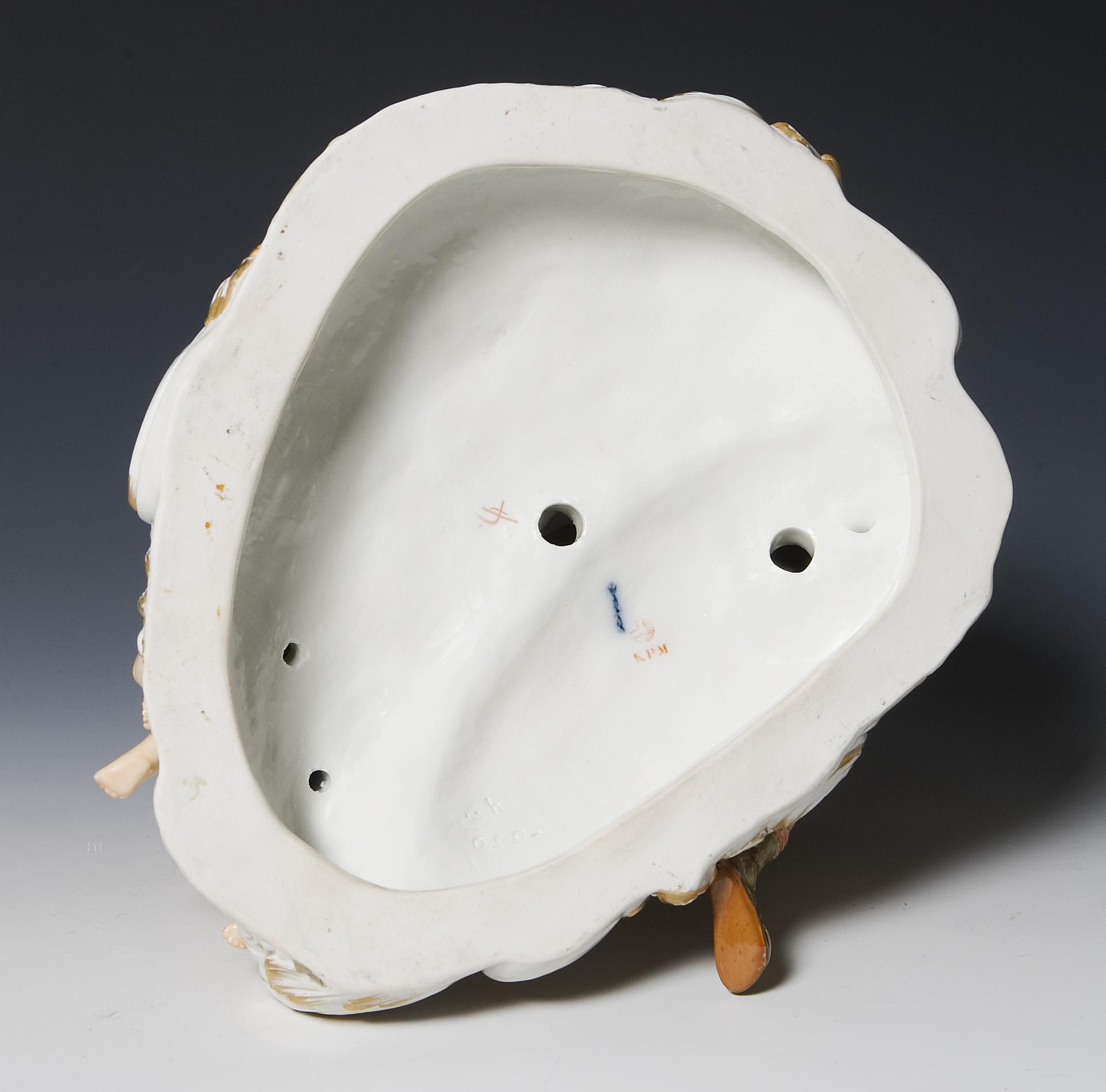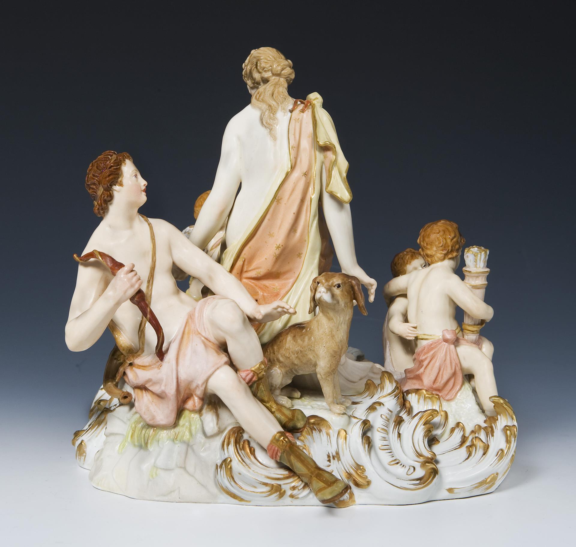 Venus, die Göttin der Liebe und der Schönheit und der schöne Jüngling Adonis, ein berühmtes Liebespaar der römischen Mythologie, die Erzählung endet tragisch, als Adonis während der Jagd von einem Eber getötet wird. Farbig bemalt, gold staffiert. Pressmarke, blaue Zeptermarke, rote Reichsapfelmarke, Malermarke. Eine Taube geklebt, Bogen, Hundeohren restauriert, ein Pfeil, eine Zehe bestoßen.