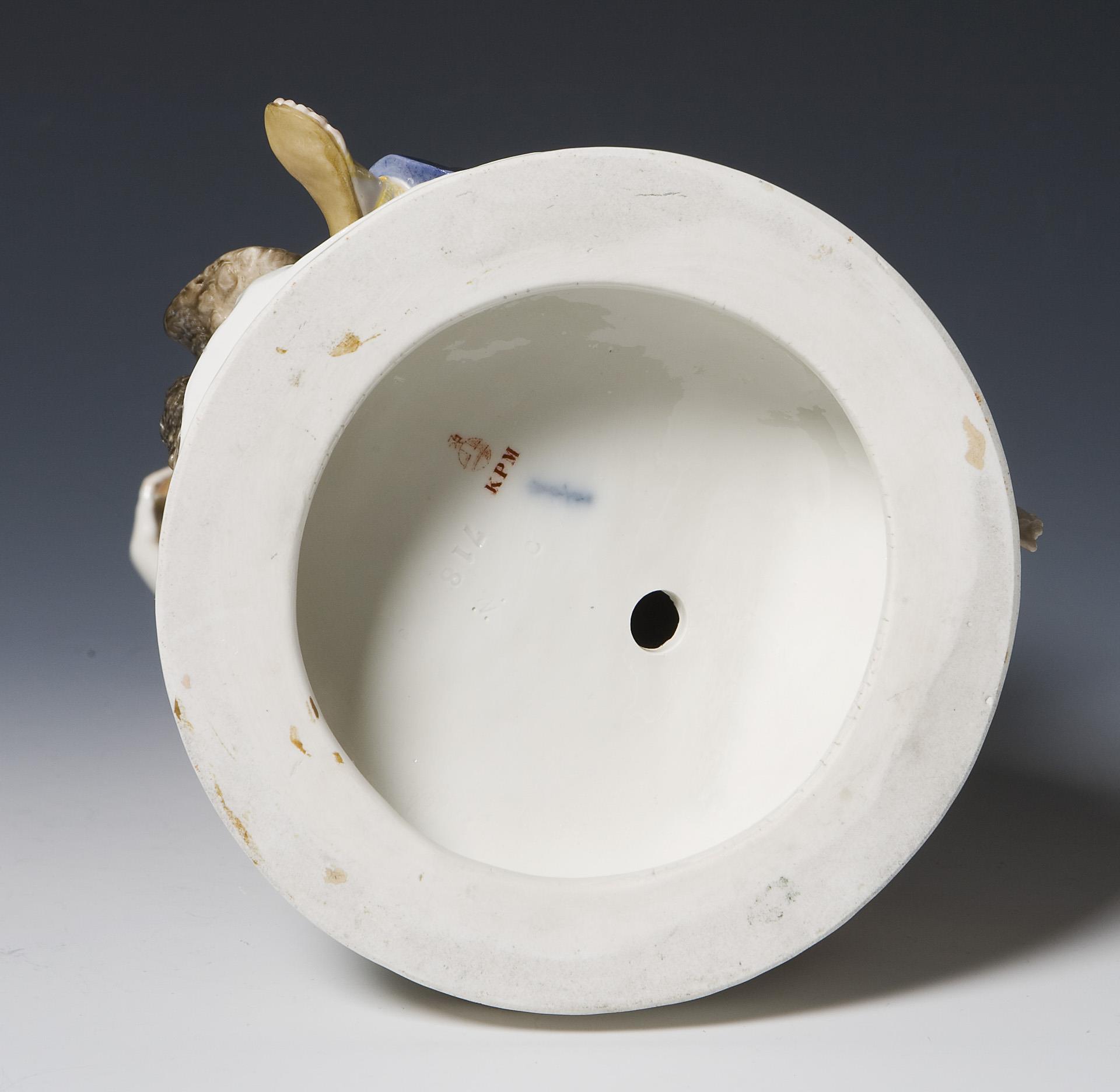 Apollo, der strahlende Gott des Lichts, des Frühlings, der Künste und der Heilkunst, Minerva, Göttin der Weisheit und Strategie. Farbig bemalt, Pressmarke, blaue Zeptermarke, rote Reichsapfelmarke. Hände des Apollo mit Lyra, ein Amor-Unterbein restauriert, eine Fingerspitze bestoßen.