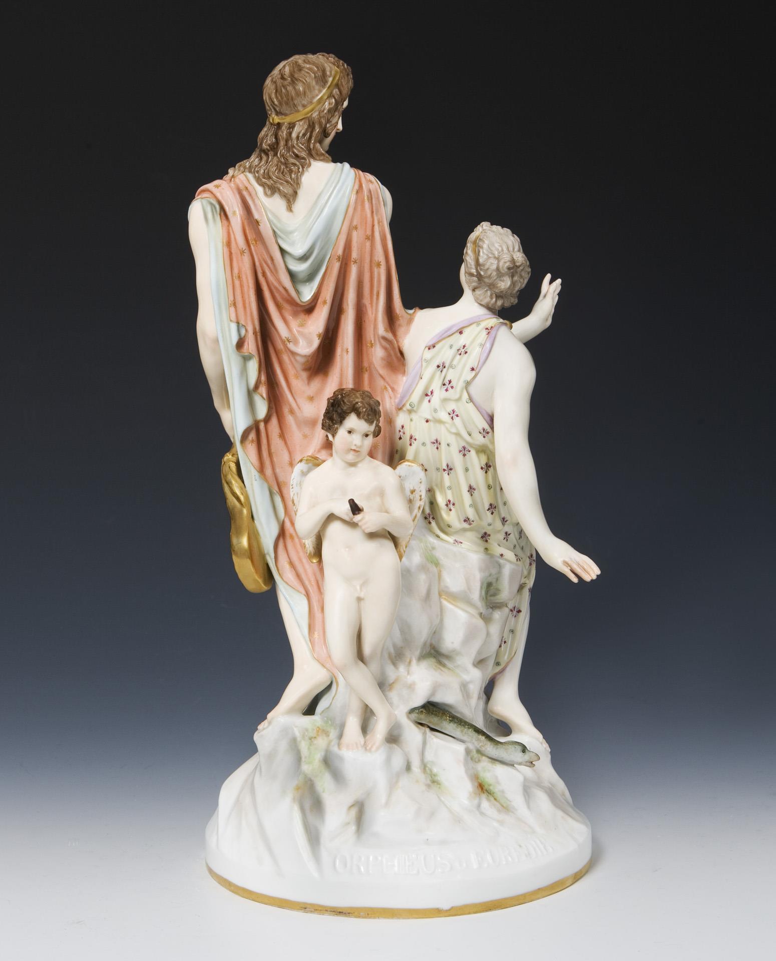 Orpheus, ein begnadeter Sänger und Musiker und die Nymphe Eurydike, ein Liebespaar der griechischen Mythologie. Farbig bemalt, gold staffiert, rückseitig am Sockel reliefierter Titel. Ritzmarke, blaue Zeptermarke, rote Reichsapfelmarke, Malermarke von Pfeifer. Finger einer Hand, eine Hand, ein halber Fuß der Nymphe, rückseitig kleiner Stab in der Hand des Amor restauriert.