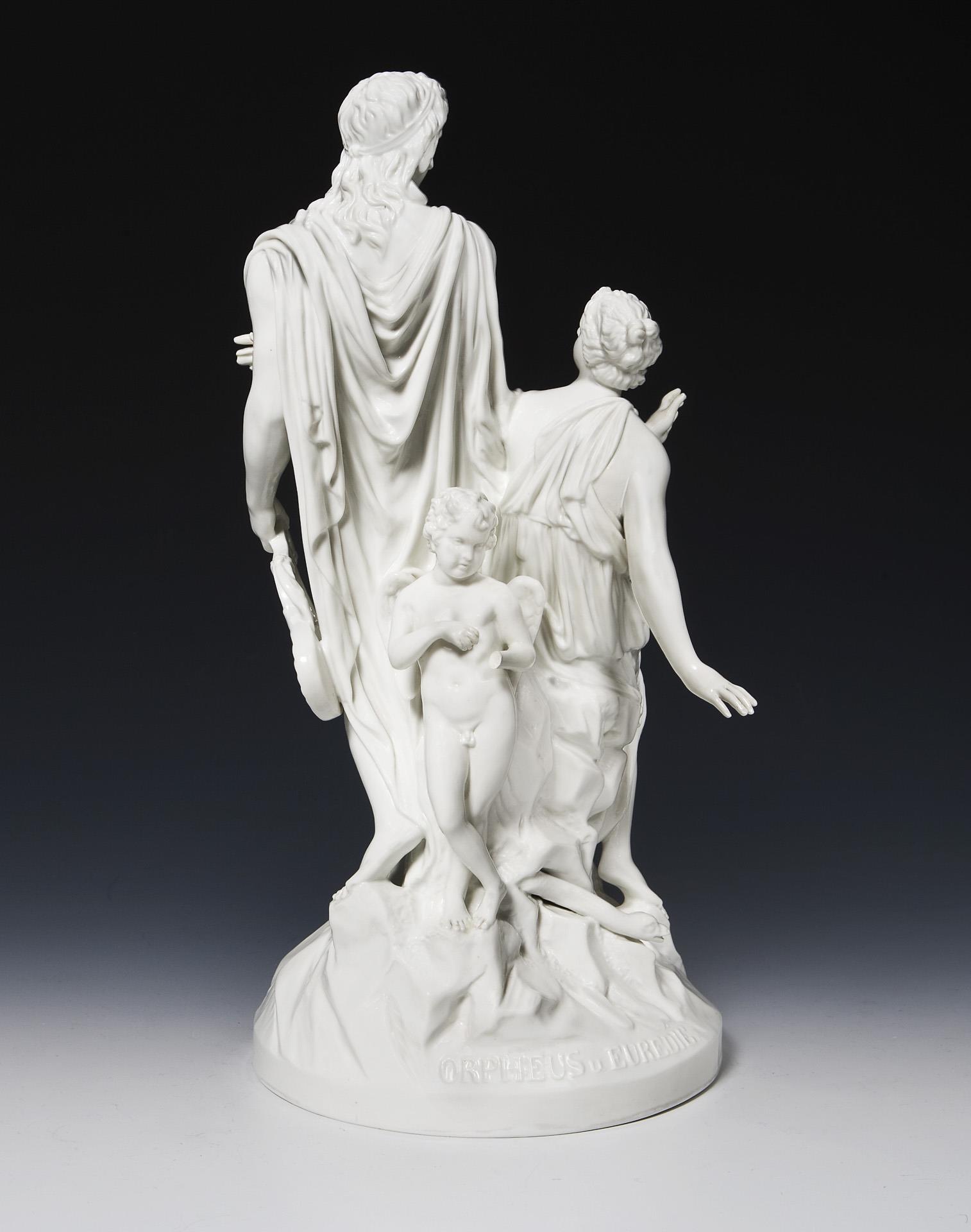 Orpheus, ein begnadeter Sänger und Musiker und die Nymphe Eurydike, ein Liebespaar der griechischen Mythologie. Weißporzellan, rückseitig am Sockel reliefierter Titel. Pressmarke, blaue Zeptermarke, ein Schleifstrich. Vier Hände, ein Arm restauriert, eine Hand fehlt.