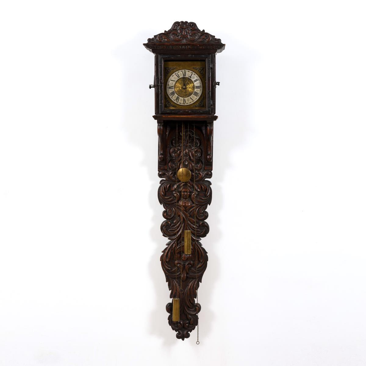 Frontseitig verglastes Historismus-Gehäuse mit geschweifter Krone und langem Pendelbrett, Schnitzrelief mit Floralwerk und Maskaronen. Funktion nicht geprüft. Leichte Alters- und Gebrauchsspuren.