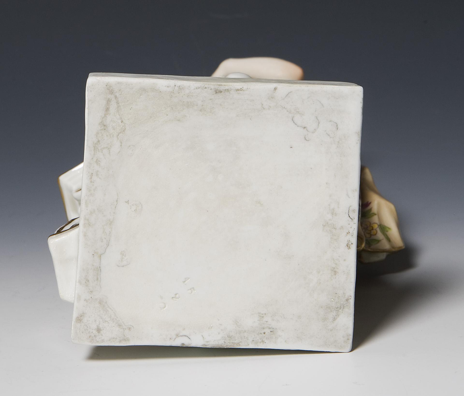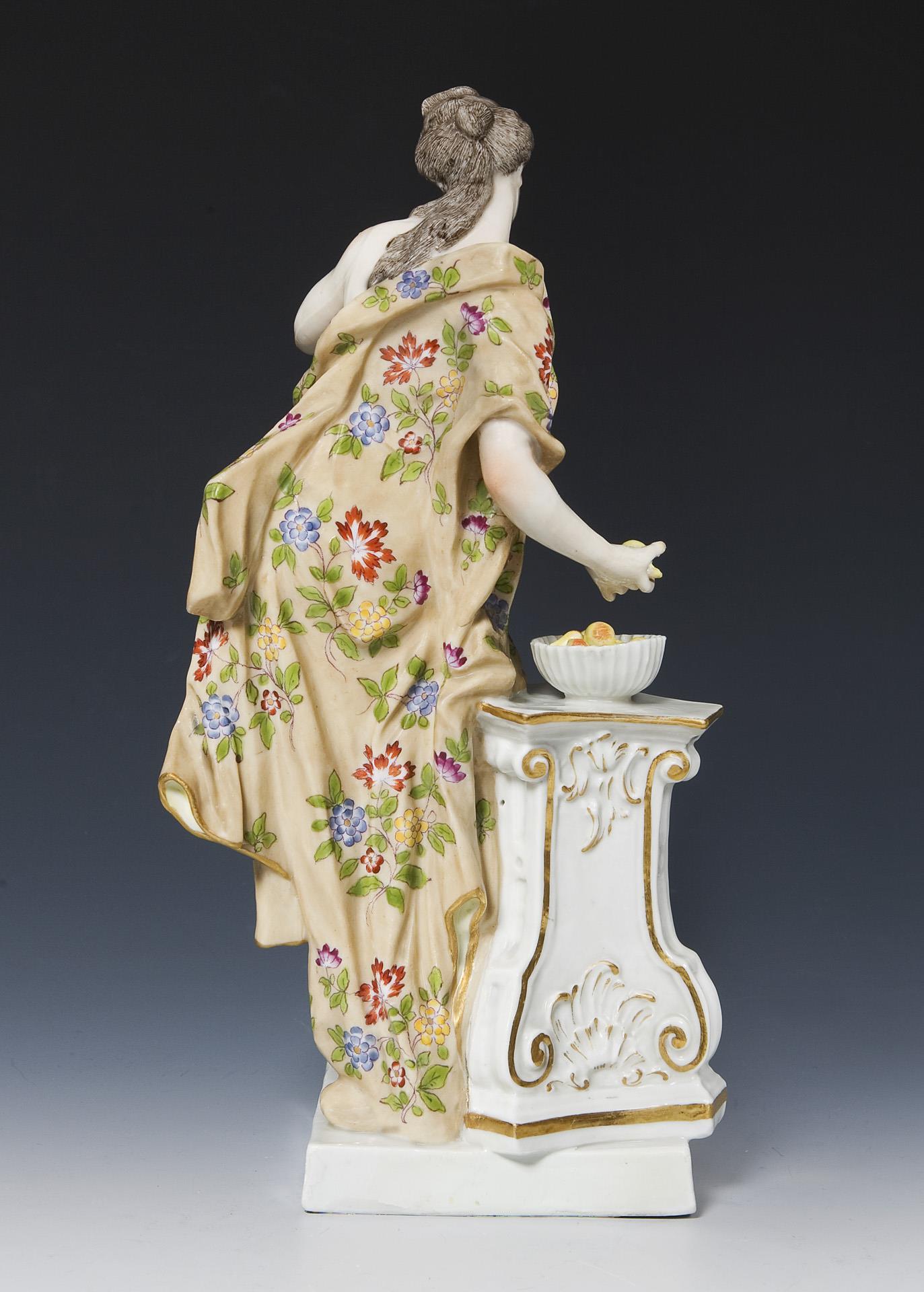 Nach einem Meissen-Modell von Johann Friedrich Eberlein (1696 Dresden - 1749 Meißen), Modell-Jahr: 1745, Modell-Nr. 694. Aus einer Serie von 5 Figuren. Farbig bemalt, gold staffiert. Unglasierter Boden, Pressmarken, ohne Bodenmarke. Sockel, die ausgestreckte Hand mit Apfel partiell restauriert, kleiner Brandriss in der Säule.