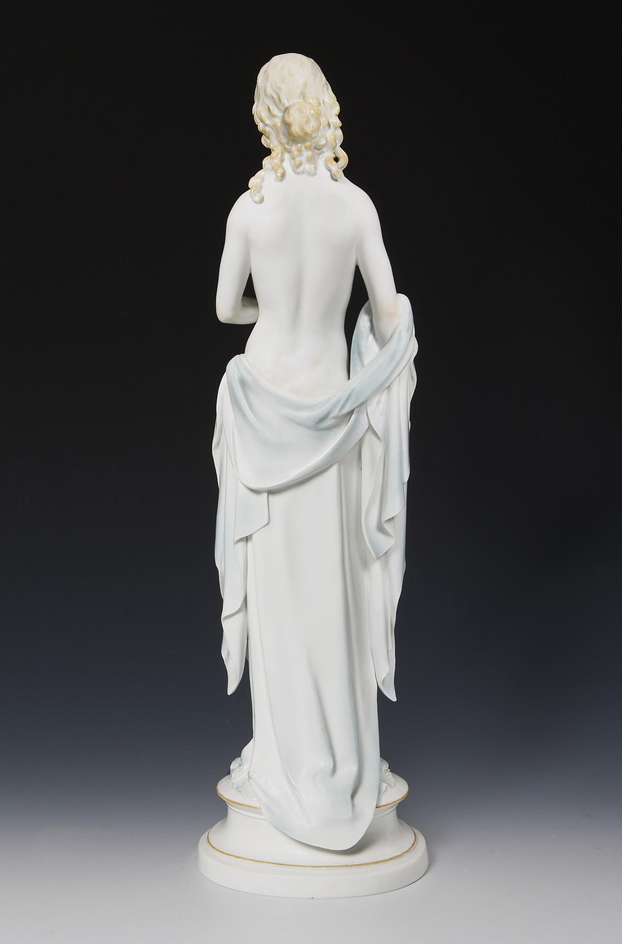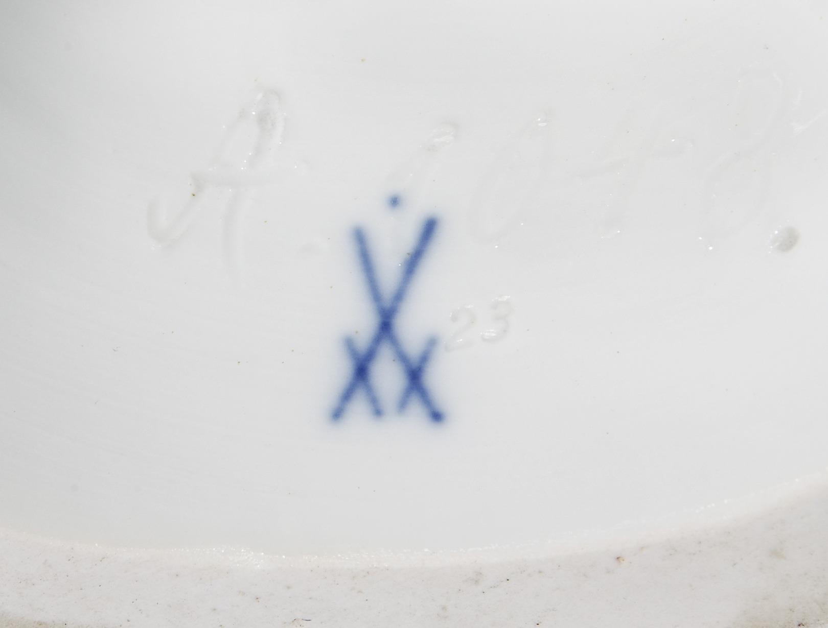 Farbig und gold staffiert. Ritzmarke, Pressmarke, Schwertermarke mit Punkt. Unterarme, Hände sichtbar restauriert, Blume fehlt, der mittige Oberkörper wurde frontal gesprüht.