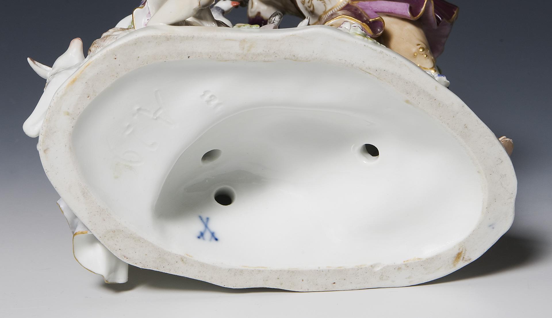 Farbig bemalt, gold staffiert. Ritzmarke, Pressmarke, Schwertermarke. Blätter, zwei Füße, eine kleine Sockelrandecke, ein Ohr restauriert.