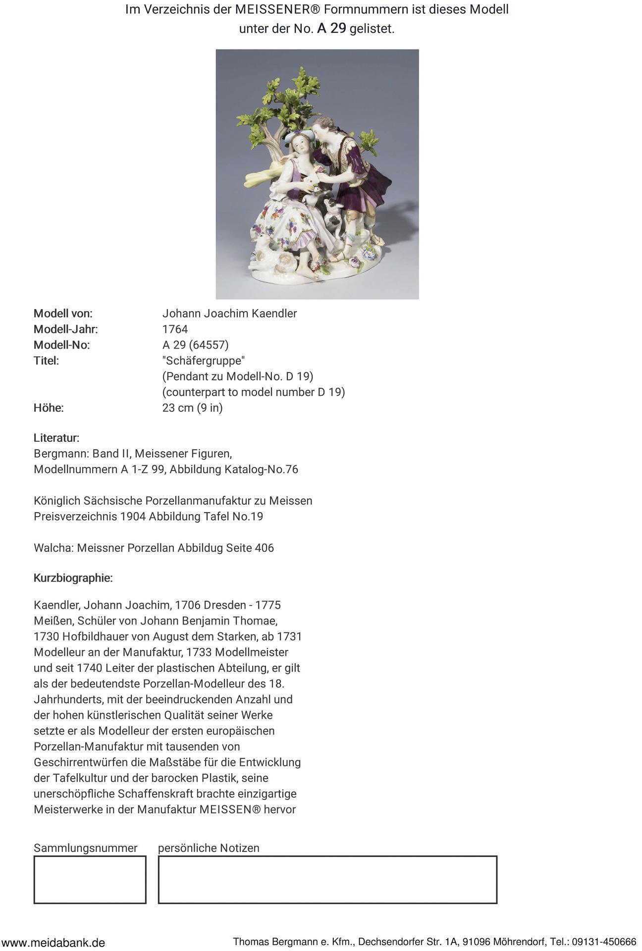 * Kaendler 1764: "Die im Monath Novembr. Angefangene Schäfer groupe wie ein junger Römisch gekleideter Schäfer seiner geliebten ein Blumen Pouquet praesentiret, einen Hund und 2 Schafe bey sich haben, auch hinter selben einige Bäumen zu sehen seynd, Vollends gefertigt, worbey auch eine Taube mit einem Briefe zu sehen ist".