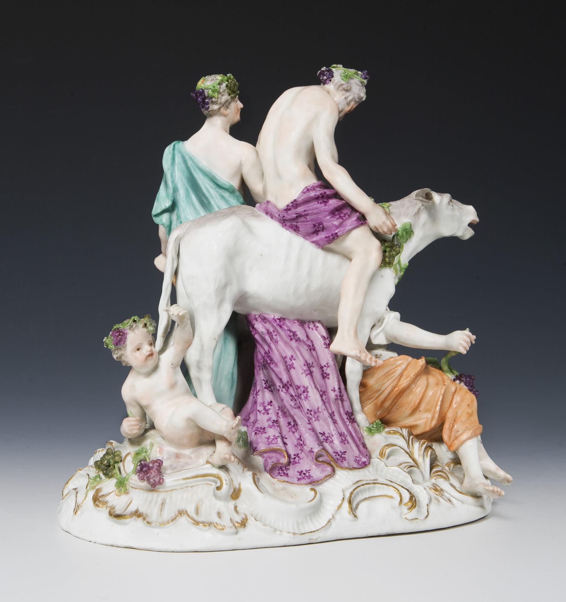 Farbig bemalt, gold staffiert, Schwertermarke. An den sitzenden Figuren ein Arm, ein Bein, ein Fuß, sechs Zehen, eine Hand, Korb, einige Blättchen, Trauben, partiell ein Esel-Bein, ein Esel-Ohr, Stab sichtbar alt restauriert, partiell kleine Glasurdefekte, Bestoßungen, ausgebesserter Brandriss im Sockel.