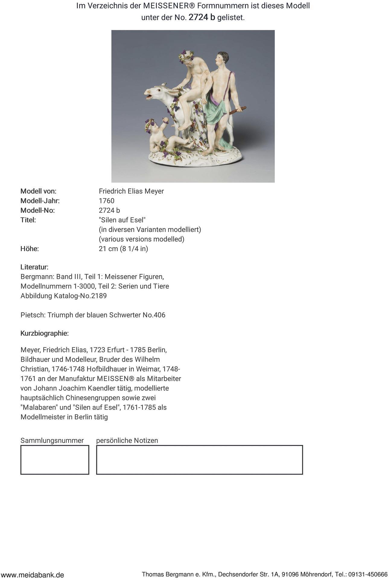 * Meyer, 1746-1748 Hofbildhauer in Weimar, 1748-1761 Modelleur an der Manufaktur Meissen, 1761-1785 Modellmeister der KPM Berlin.