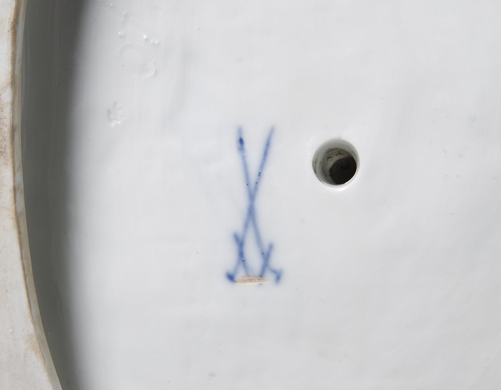Farbig bemalt, gold staffiert. Ritzmarke, Pressmarke, Malermarke, Schwertermarke einmal gestrichen. Stand leicht uneben, Blätter auf dem Sockel, wenige Blüten und Blättchen der Girlande restauriert, wenige Blättchen bestoßen.
