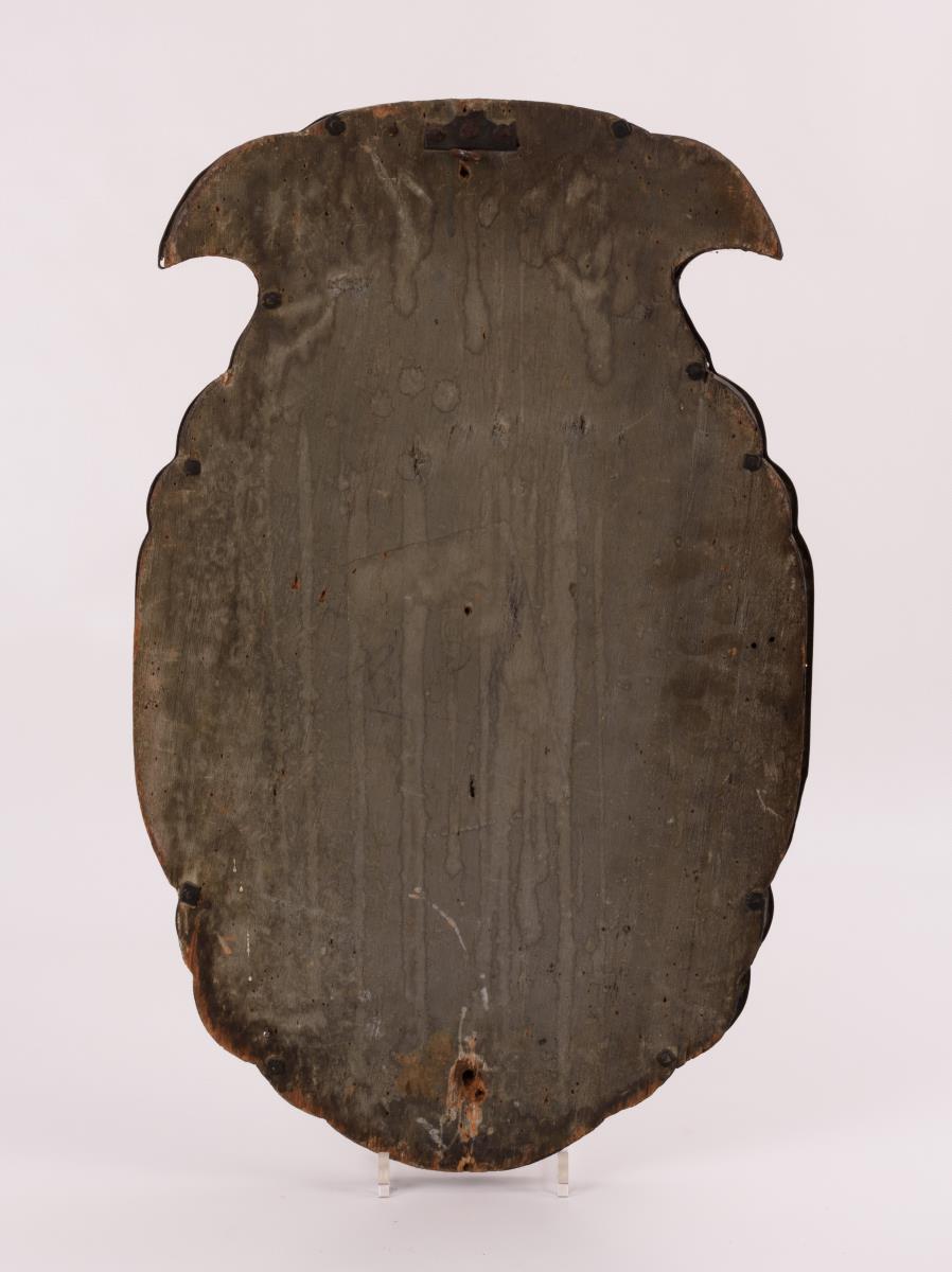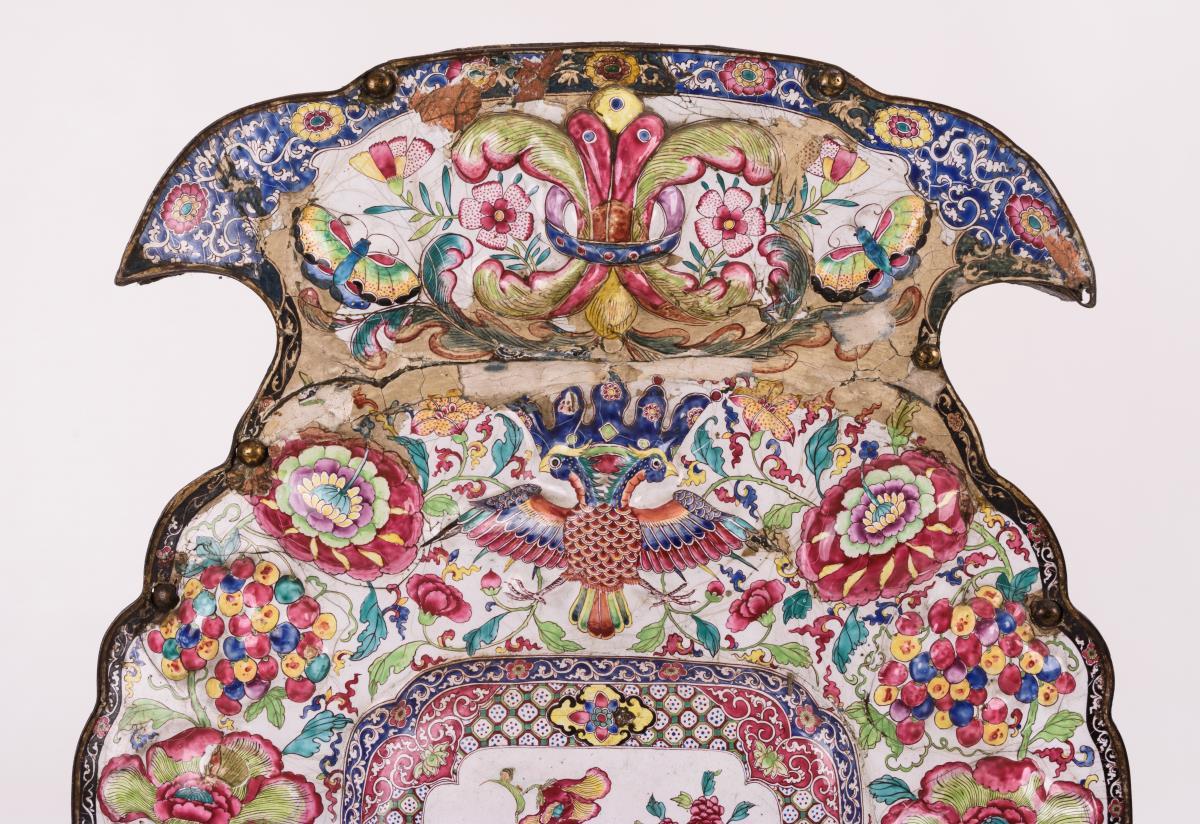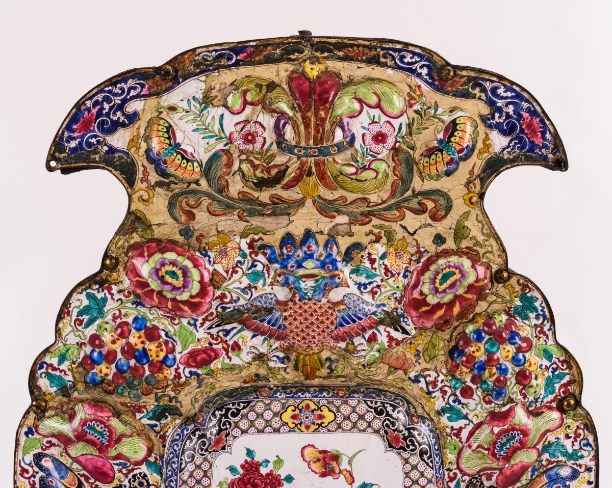 Auf dem geschweiften Grundbrett montierte, reliefierte Kupferplatten mit farbfreudiger Malerei auf weißem Grund: Blumen, Vögel und Schmetterlinge sowie ein gekrönter Doppeladler. Ohne Kerzenhalter, restaurierungsbedürftig, mit alten Restaurierungen.