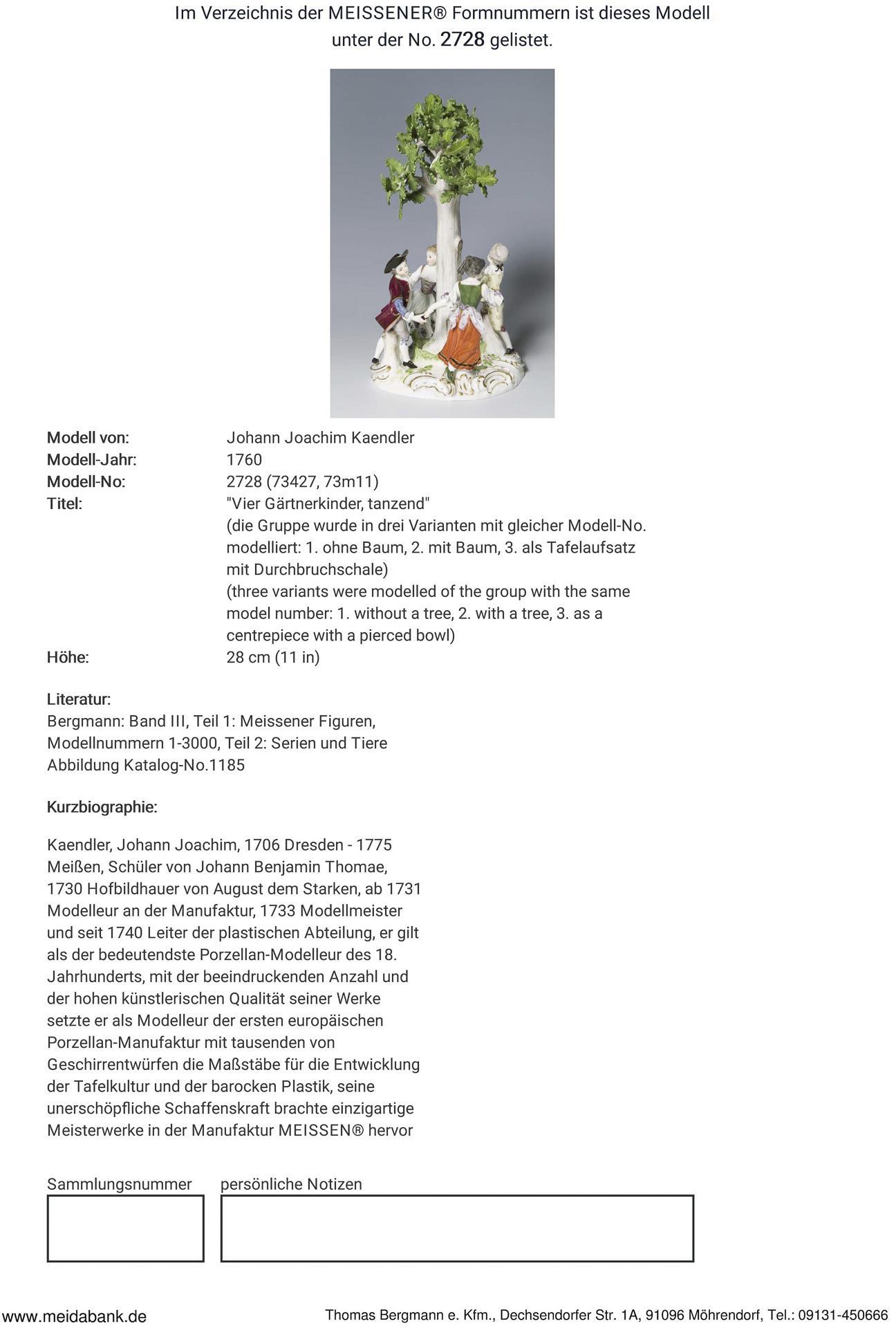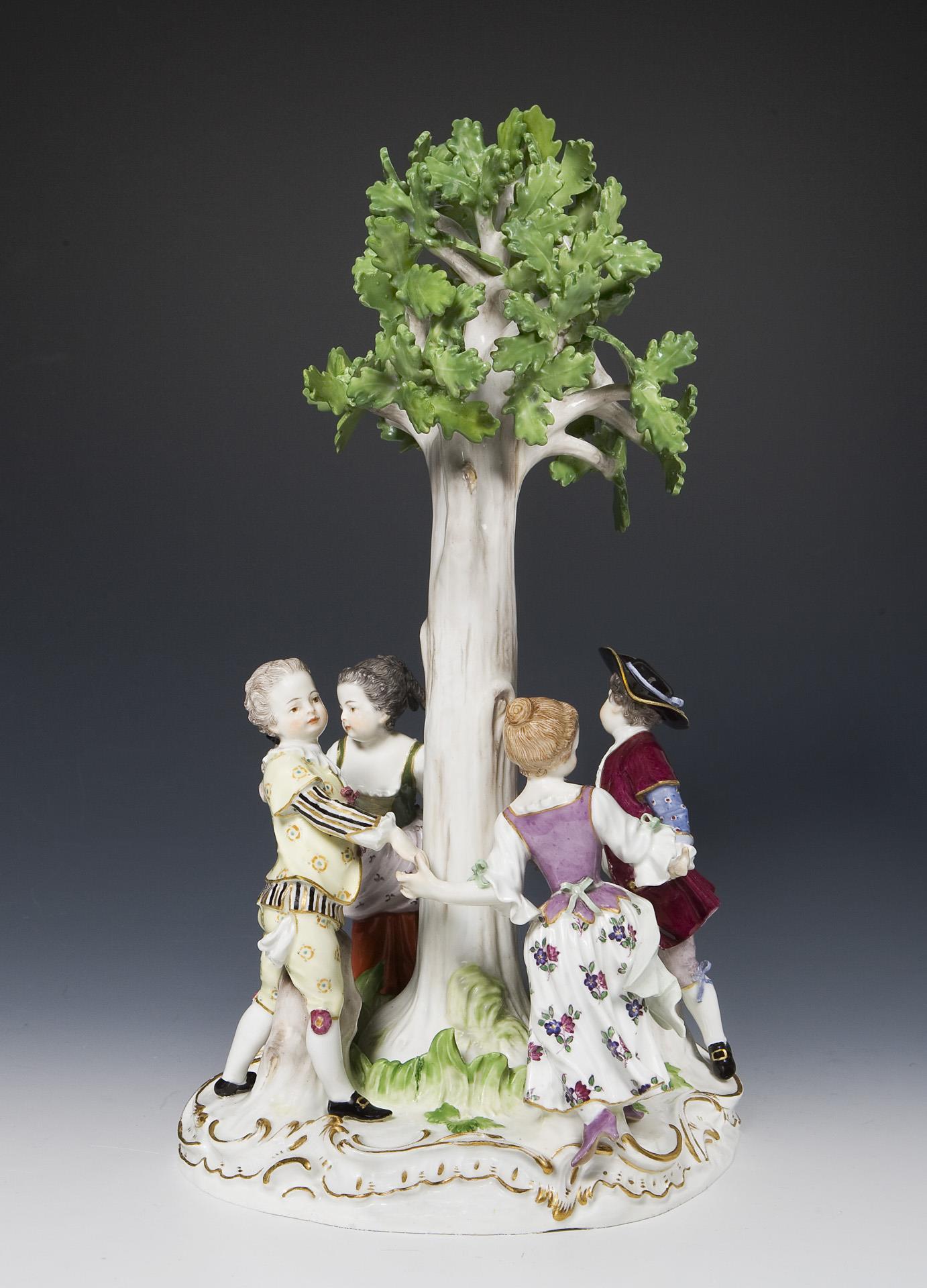 farbig bemalt, gold staffiert, Baum montiert (die Gruppe wurde in drei Varianten modelliert: 1. ohne Baum, 2. mit Baum, 3. als Tafelaufsatz mit Durchbruchschale). Ritzmarke, Pressmarke, Malermarke, Schwertermarke. Blätter, ein Arm, zwei Hände restauriert.