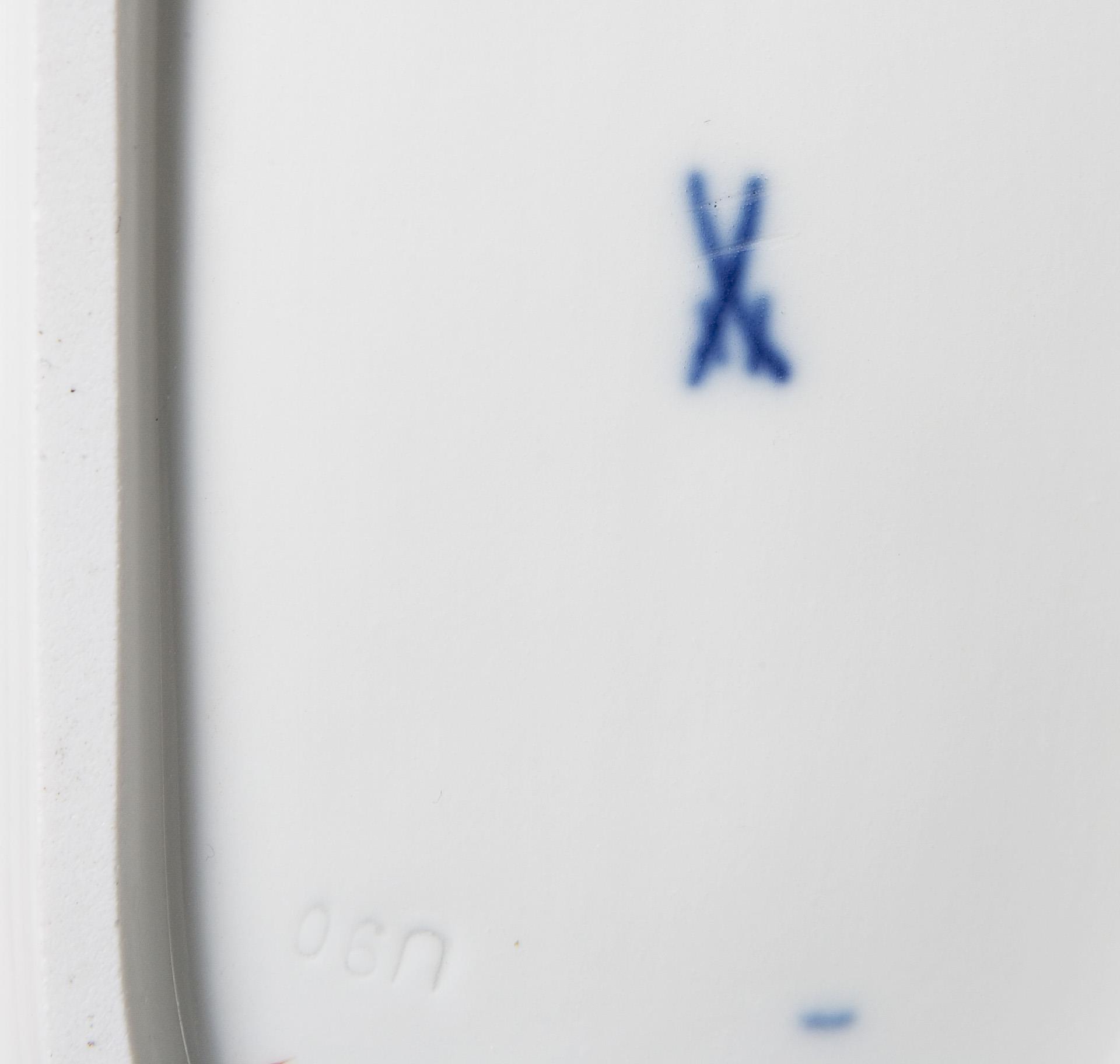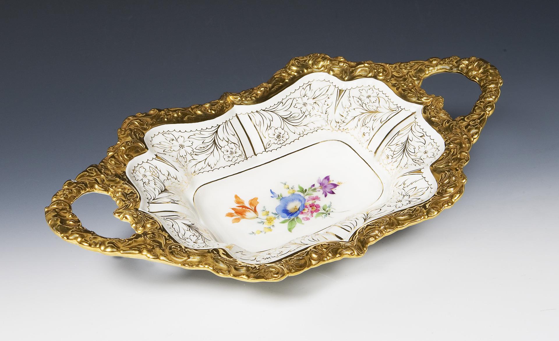 Modell von Johann Gottfried Dressler und Mitarbeiter, Modell-Jahr: 1834-1836. Farbig bemalt, floral und ornamental reliefiert, gold staffiert, breiter vergoldeter Rand. Pressmarken, Malermarke, Schwertermarke zweimal gestrichen. Ein Henkel bestoßen.