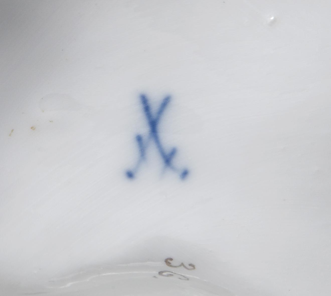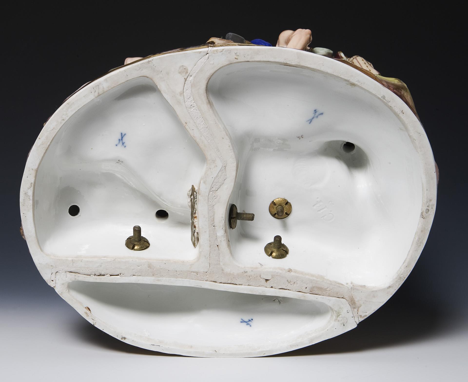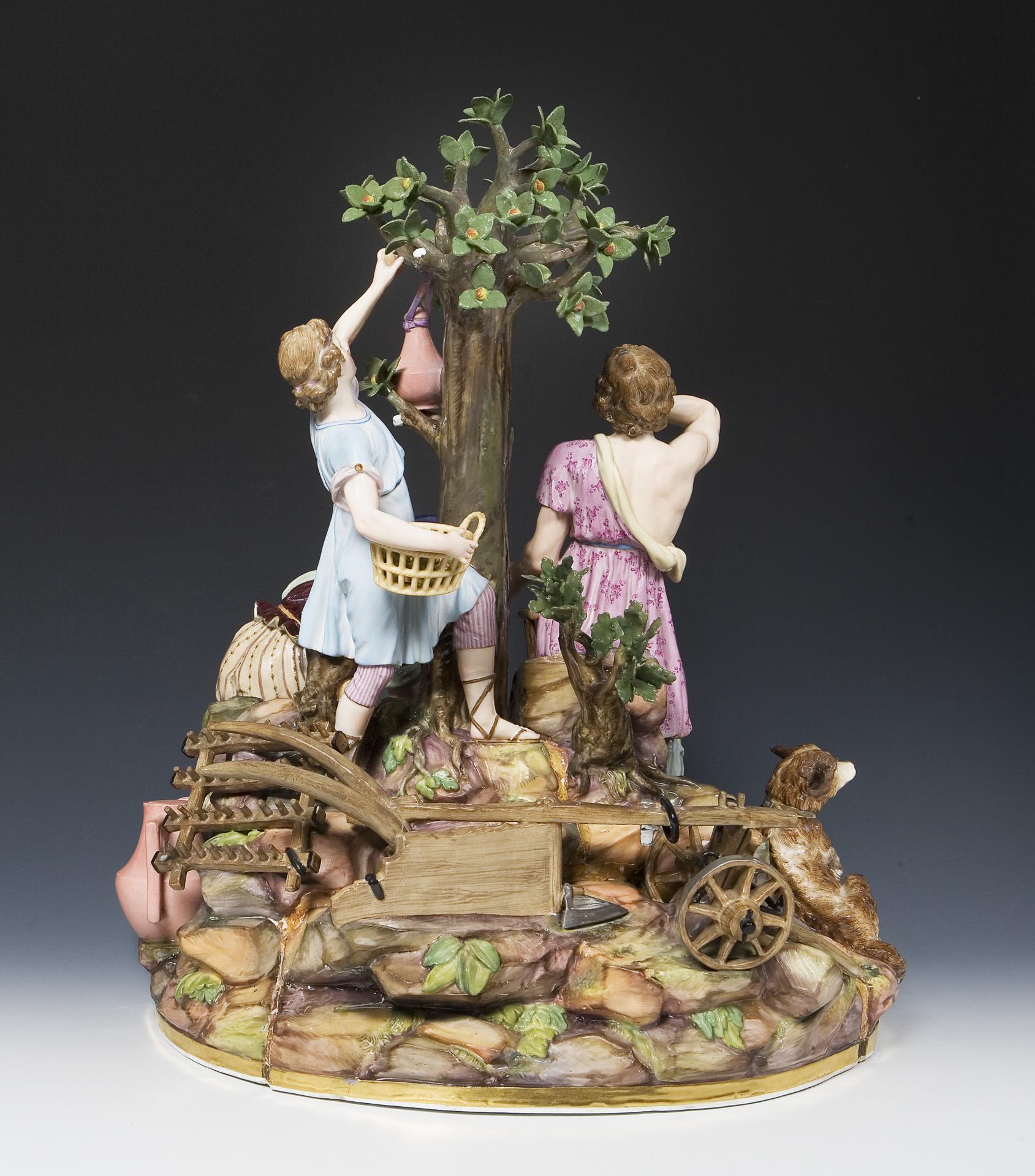 Farbig bemalt, gold staffierter Rand. Die große Gruppe wurde aus drei Teilen zusammenmontiert. Ritzmarke, Pressmarke, zwei Malermarken je 36, drei Schwertermarken. Sichtbare Montierungsadern, Baum, Flasche, Blätter, Finger einer Hand, zwei Hände mit Axt und Baumstumpf, Gespann mit Pflug und Egge, Hundekopf, Rechen restauriert, ein Pflughenkel geklebt, zwei Äste, eine Zinke, ein Flügel bestoßen.