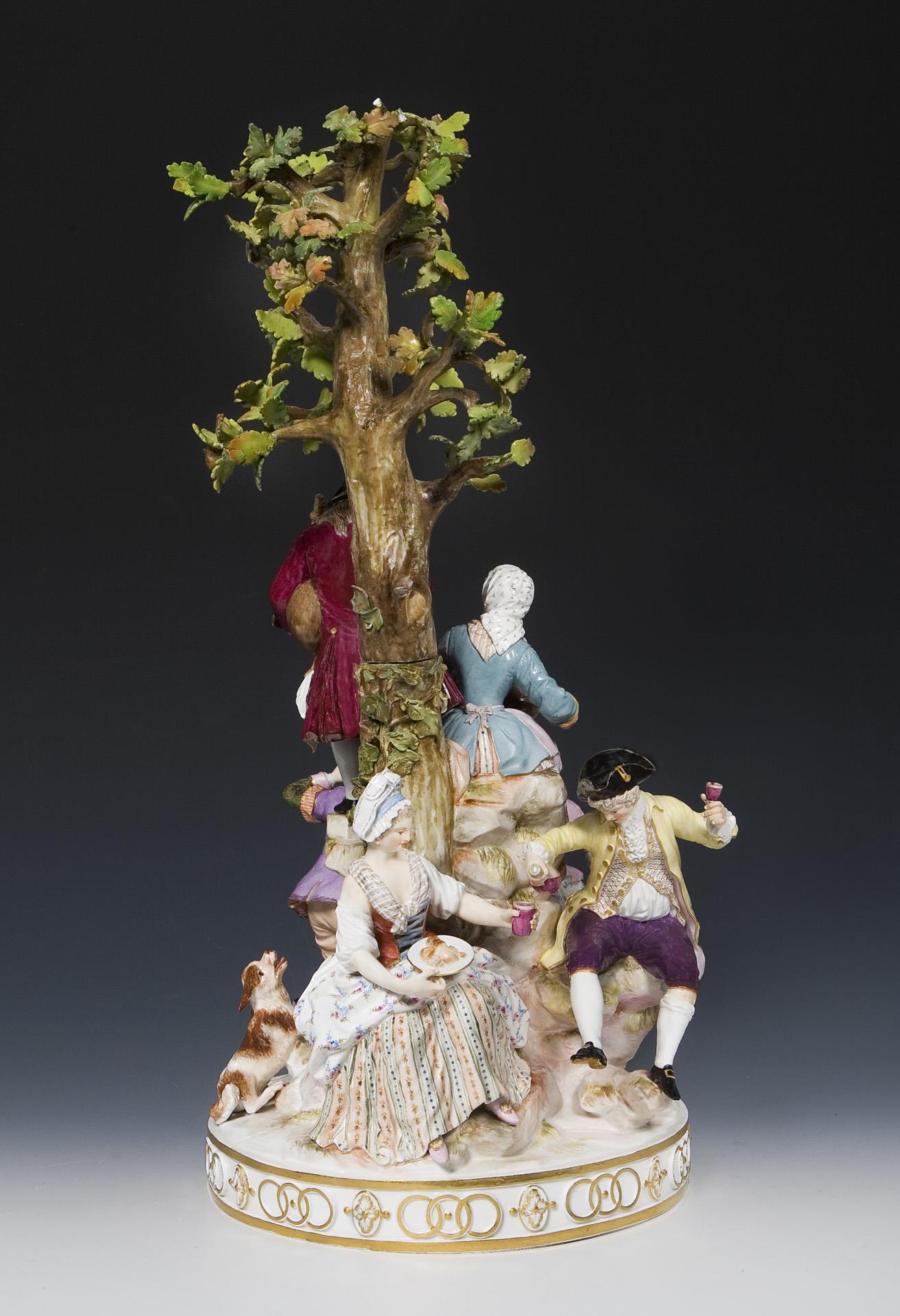 Pendant zu Modell-Nr. D 93, farbig bemalt, gold staffiert. Baum lose aufgesteckt, Ritzmarke, Pressmarke, Malermarke, Schwertermarke. Baum, Blätter, Hundeohren, fünf Füße, Finger einer Hand, eine Rockecke restauriert, oben Blätter bestoßen, lose vorhanden, kleiner Brandriss in einem Finger, in einer Schuhspitze.