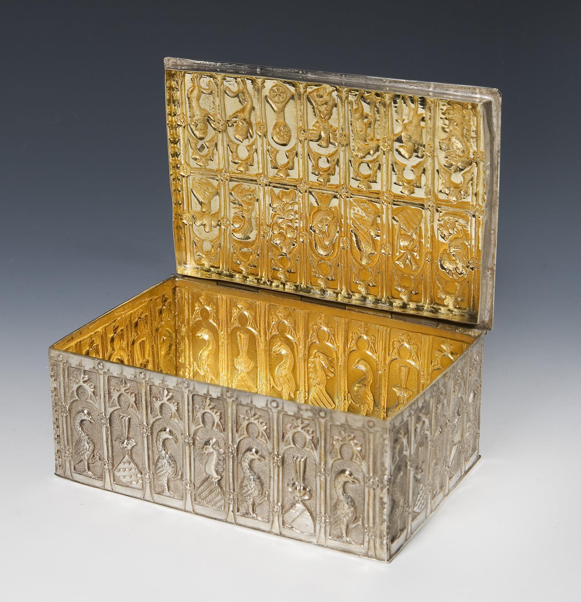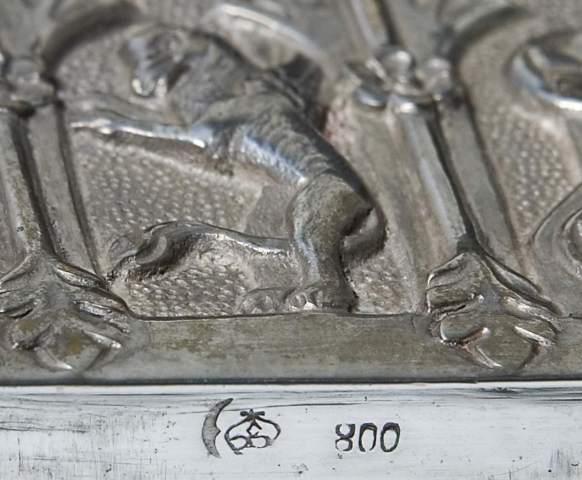 Umlaufend und auf dem Deckel in 42 Feldern verschiedene heraldische Figuren. Rechteckiger Korpus mit bündig schließendem Scharnierdeckel. Punzen: Halbmond und Krone, Feingehalt.