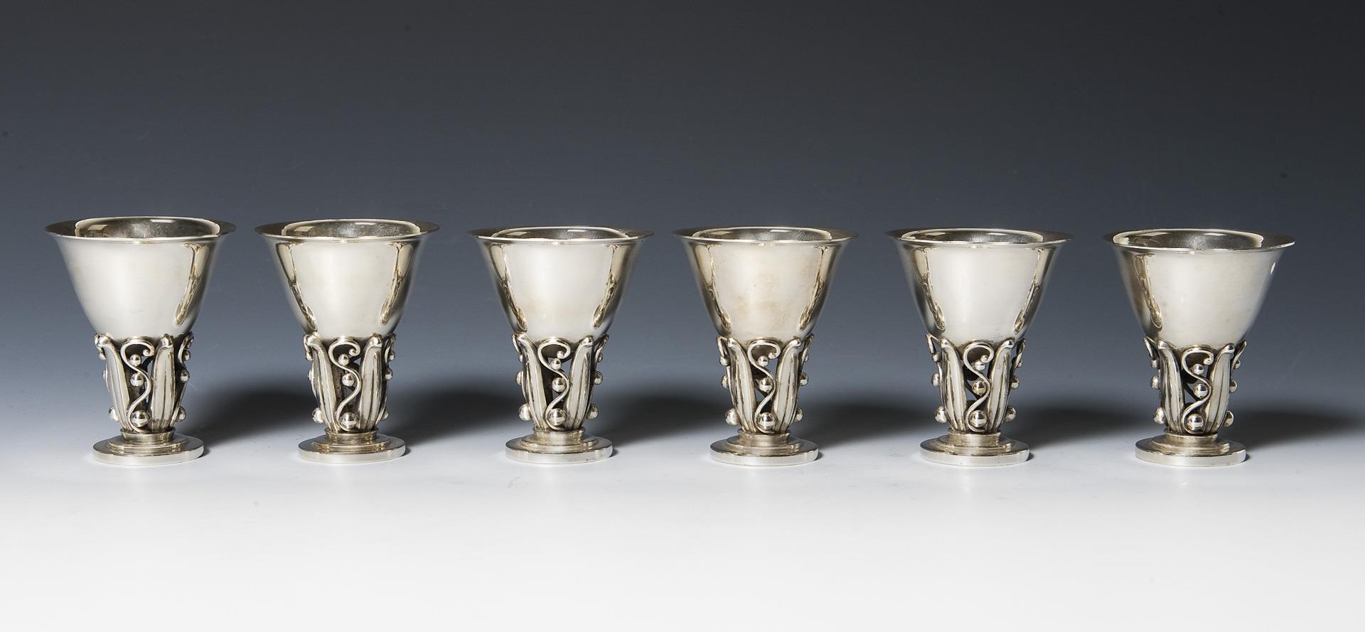 Glockenförmige Kuppa über durchbrochen gearbeitetem Schaft mit Kugel- und Blattdekor, stufig abgesetzter Rundfuß. Punzen mit Feingehalt und Manufakturmarke, zwei Becher mit Beschaumeister-Marke von Johannes Siggaard von 1940.