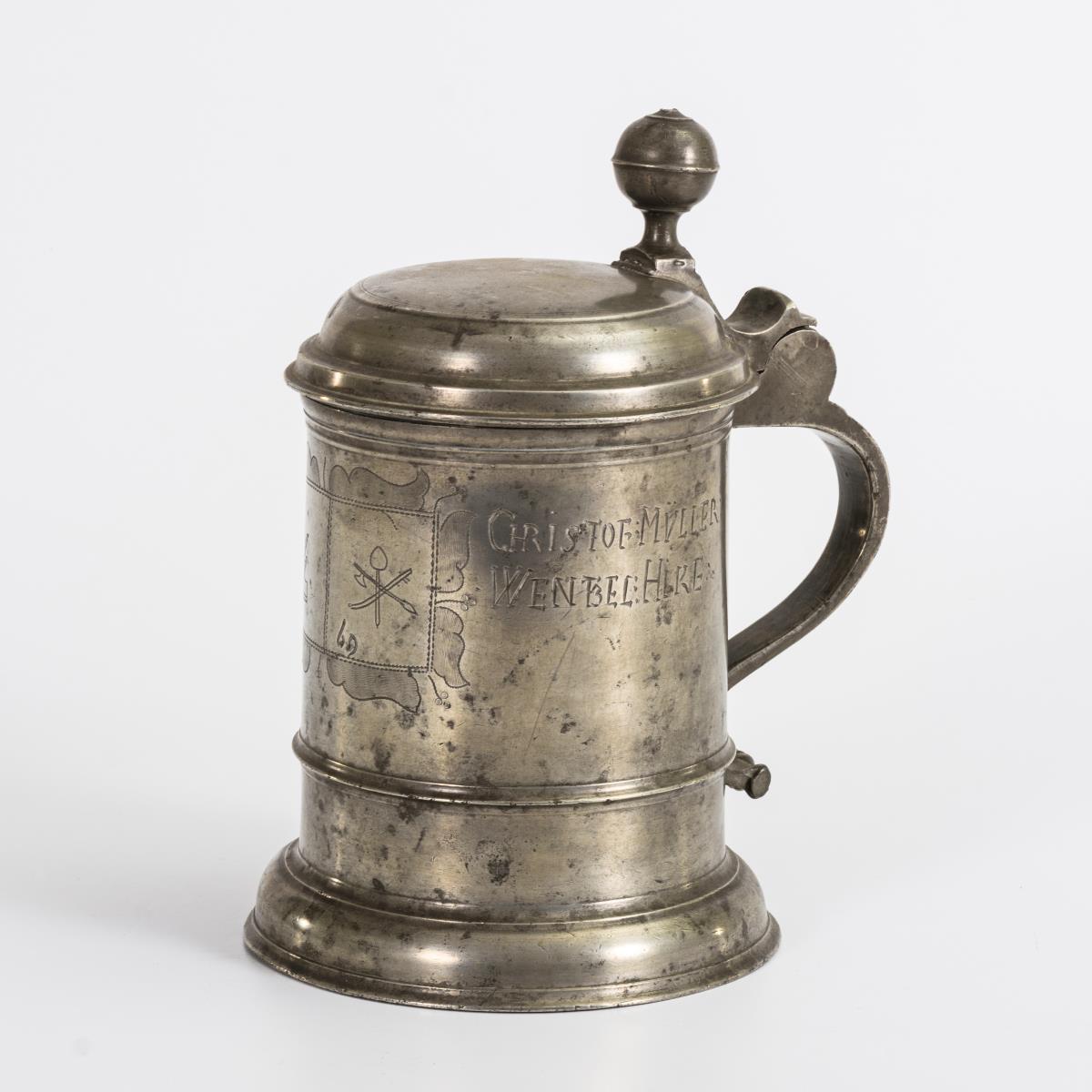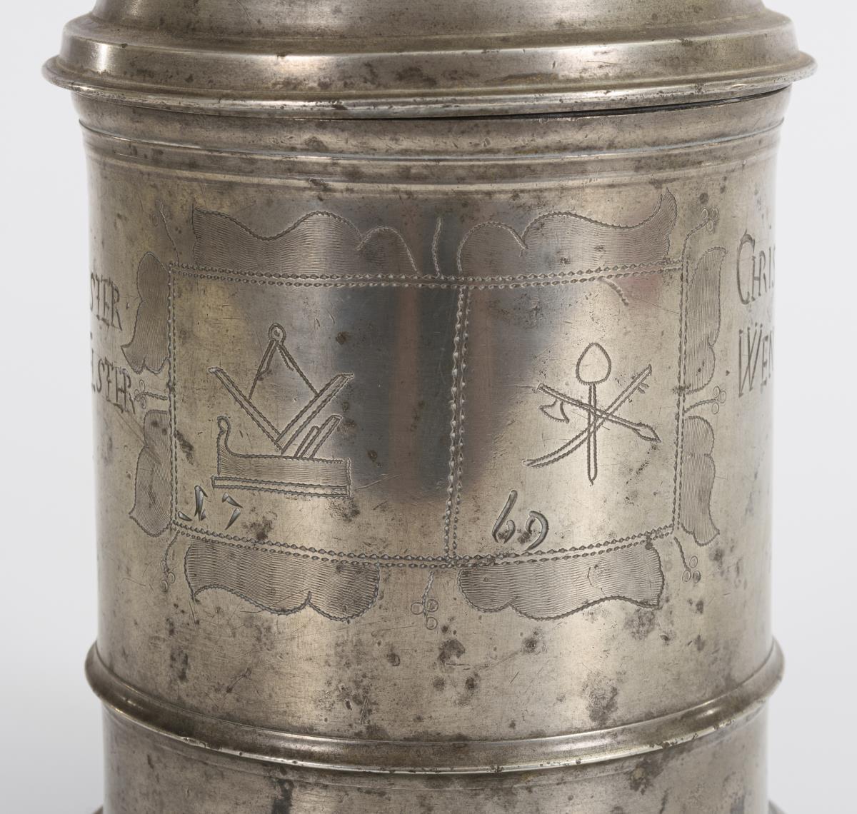 Großer Walzenkrug mit den Zunftzeichen der Schreiner und Metzger.