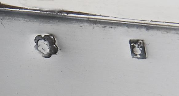 Leicht gemuldete Rechteckform, der durchbrochen gearbeitete Rand mit stilisiertem floralem Reliefdekor. Punzen: Dianakopf, Meistermarke.