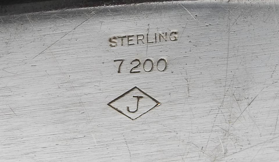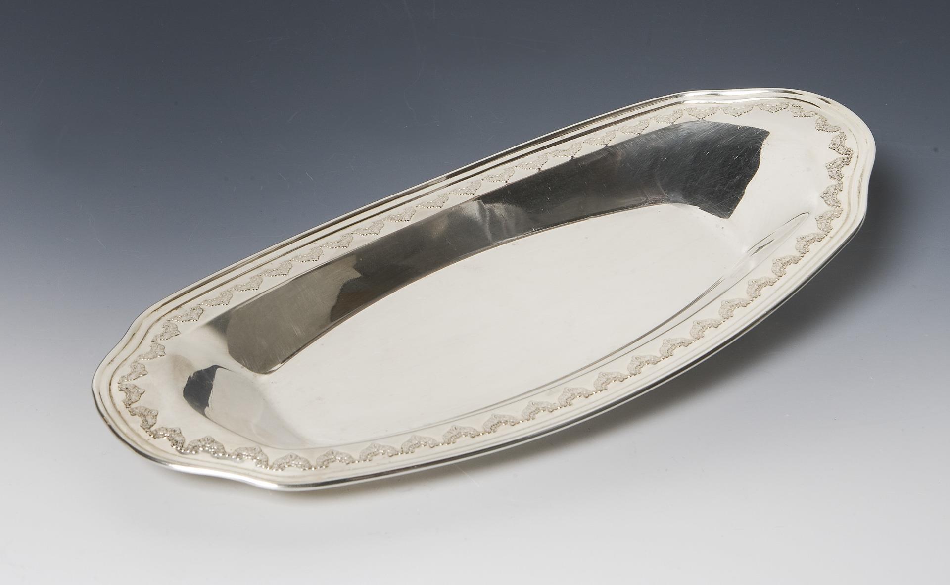 Schmale ovale, leicht gemuldete Form mit ornamental reliefierter Fahne und geschweiftem Profilrand. Punzen: Feingehalt, Manufakturmarke J in Raute. Eine kleine Delle.