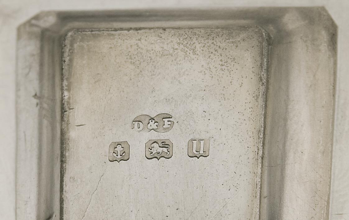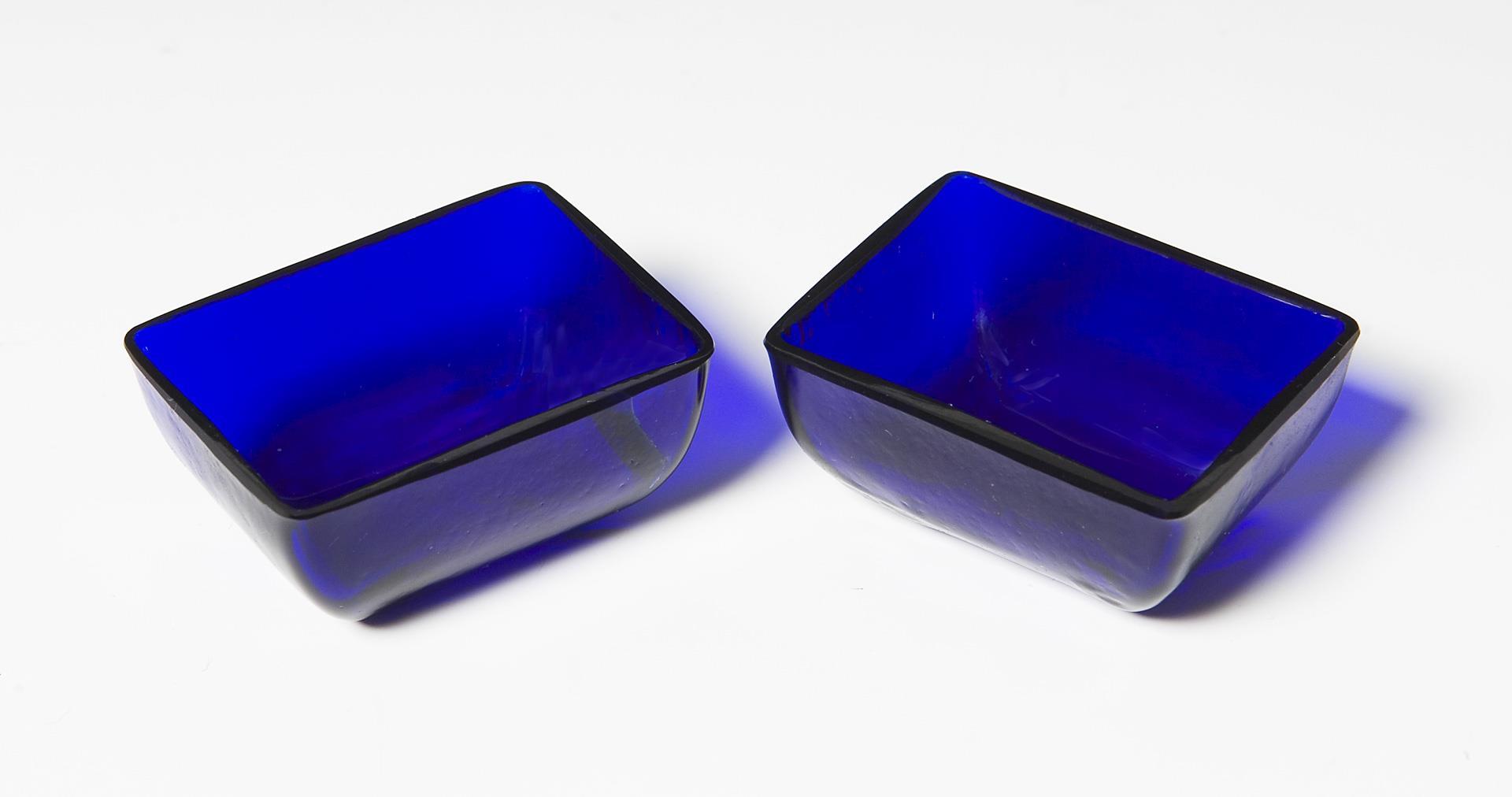 Zeitlose profilierte Rechteckform, originale kobaltblaue Glaseinsätze, zwei Löffelchen 1909-1910. Ein Glaseinsatz mit Haarriss.