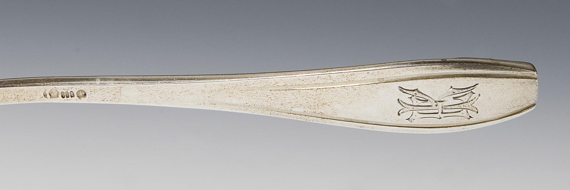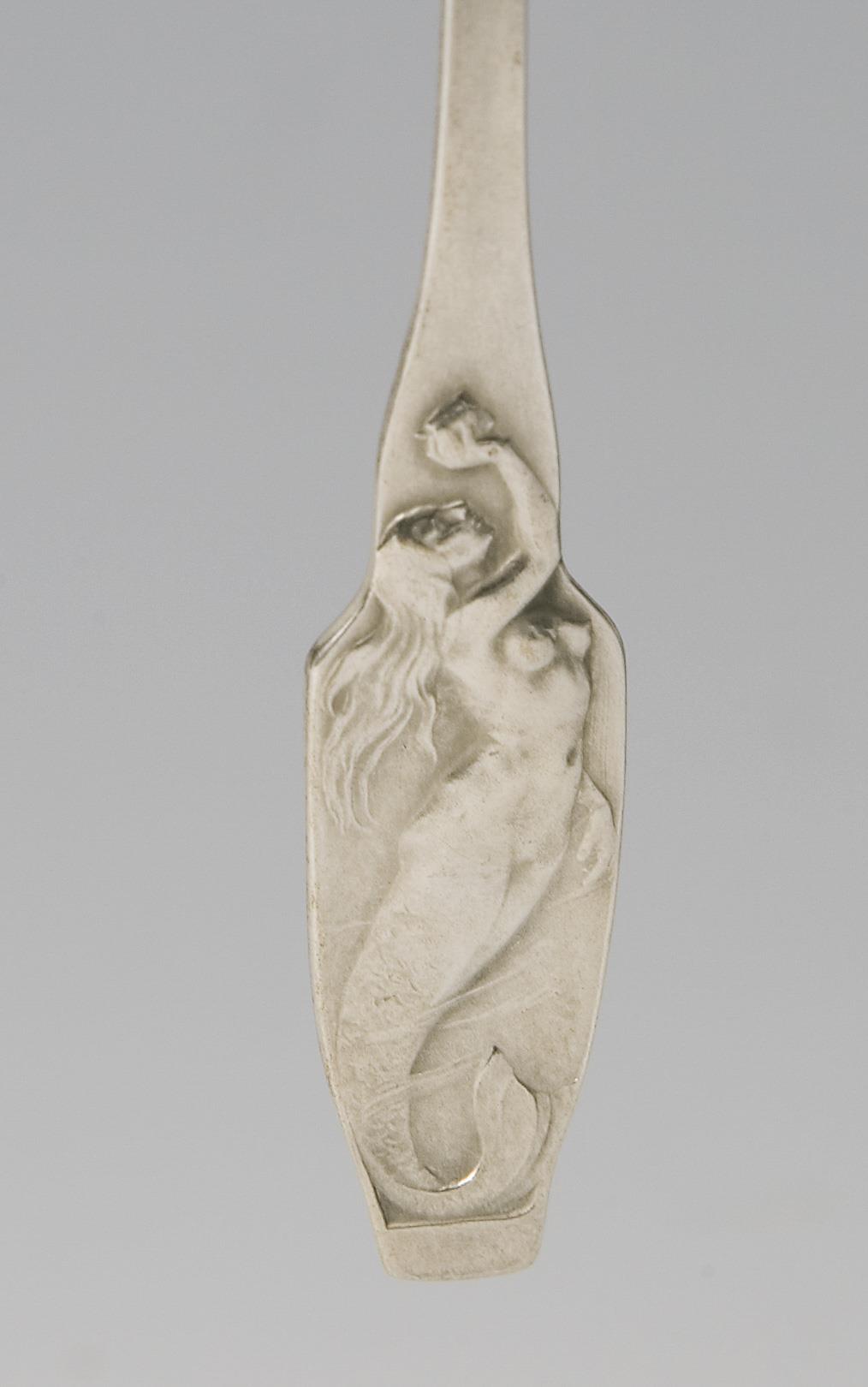 Modell-Jahr: 1903-1904. 5 Löffel aus der "Wagner-Serie", Modell von Adolf Amberg (1874-1913), beidseits reliefiert. 6 Löffel aus der "Märchen-Serie", Modell von Hugo Cauer (1864-1918), frontal reliefiert, rückseitig gravierte Monogramme. Punzen: Halbmond und Krone, Feingehalt, Manufakturmarke.