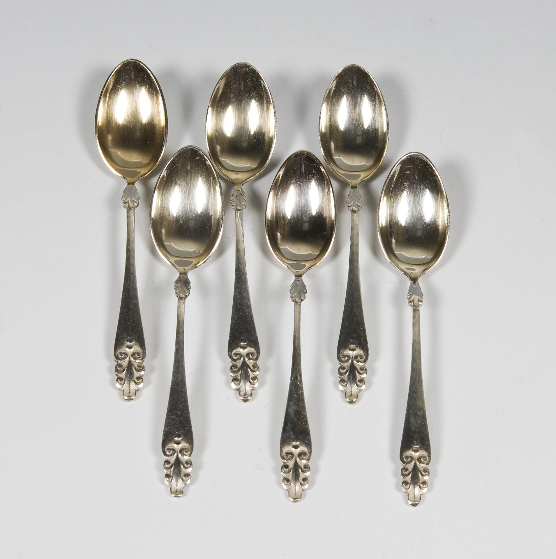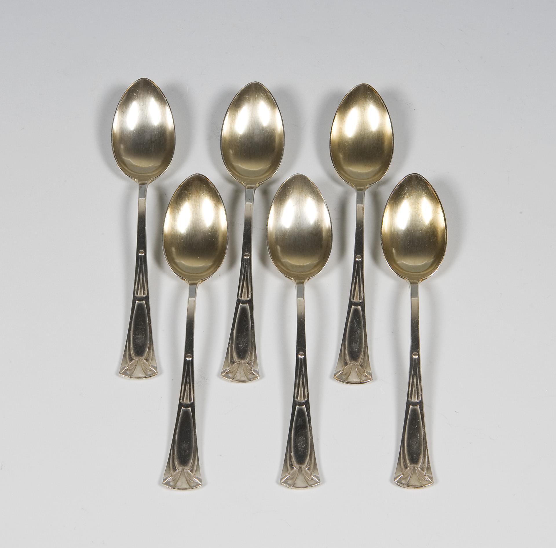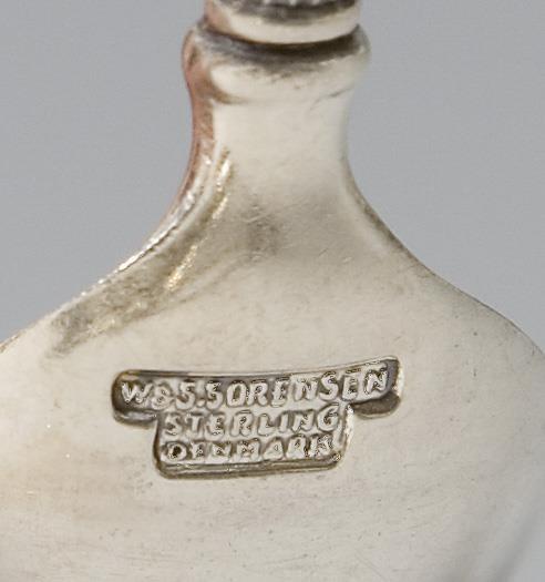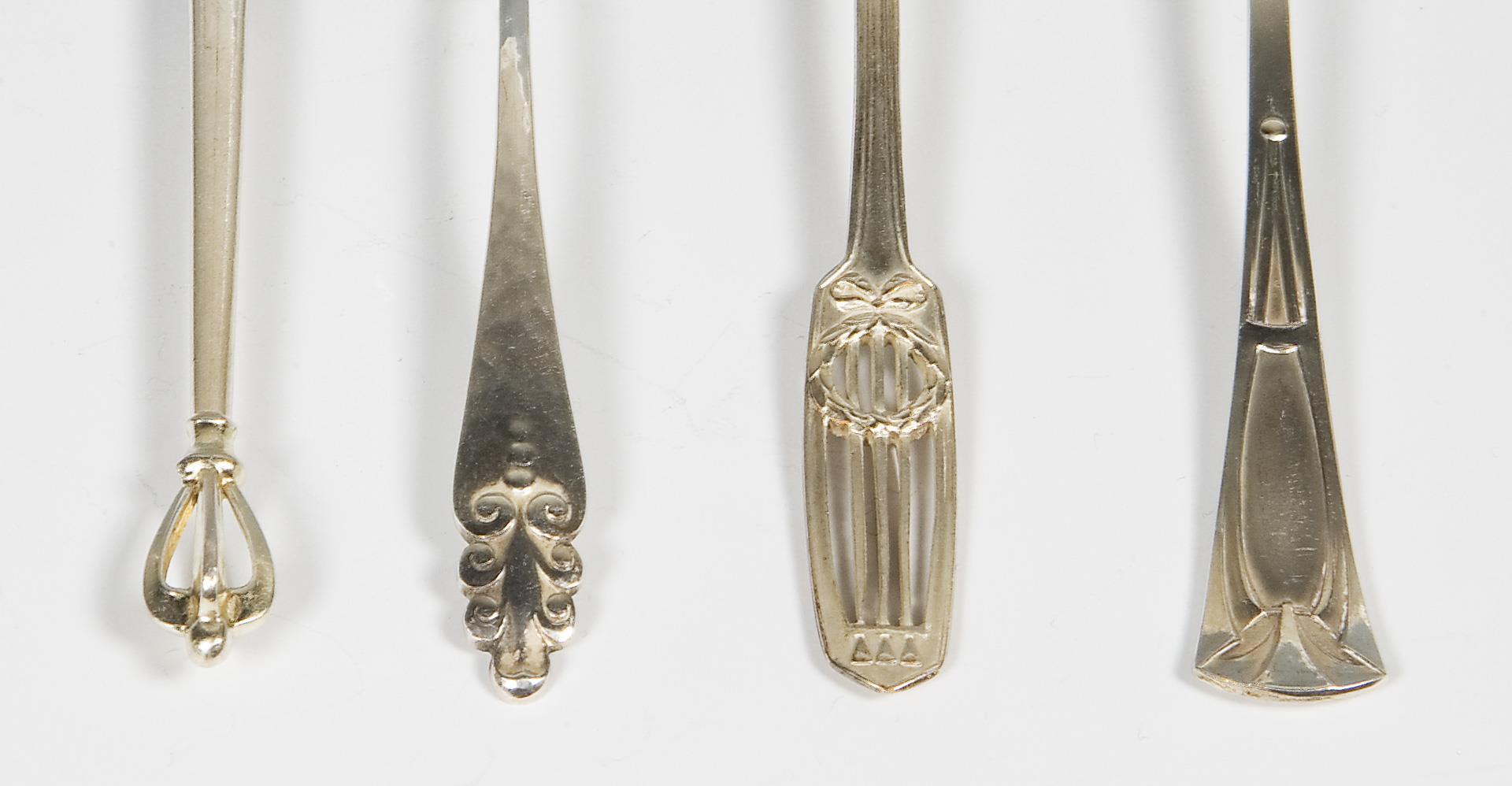 1. Bremer Silberwarenfabrik, 800er Silber, beidseits reliefiert, Namenszug Carl Jasper (Juwelier). 2. Wilkens & Söhne, Hemelingen, 800er Silber, frontal leichtes Hammerschlagdekor, stilisiertes Relief. 3. Koch & Bergfeld, Bremen, 800er Silber, Enden durchbrochen gearbeitet, beidseits reliefiert. 4. W. & S. Sorensen, Denmark, Sterlingsilber, vergoldete durchbrochen gearbeitete Bekrönung. Punzen: 18 Löffel mit Halbmond und Krone, Feingehalt, Manufakturmarke.