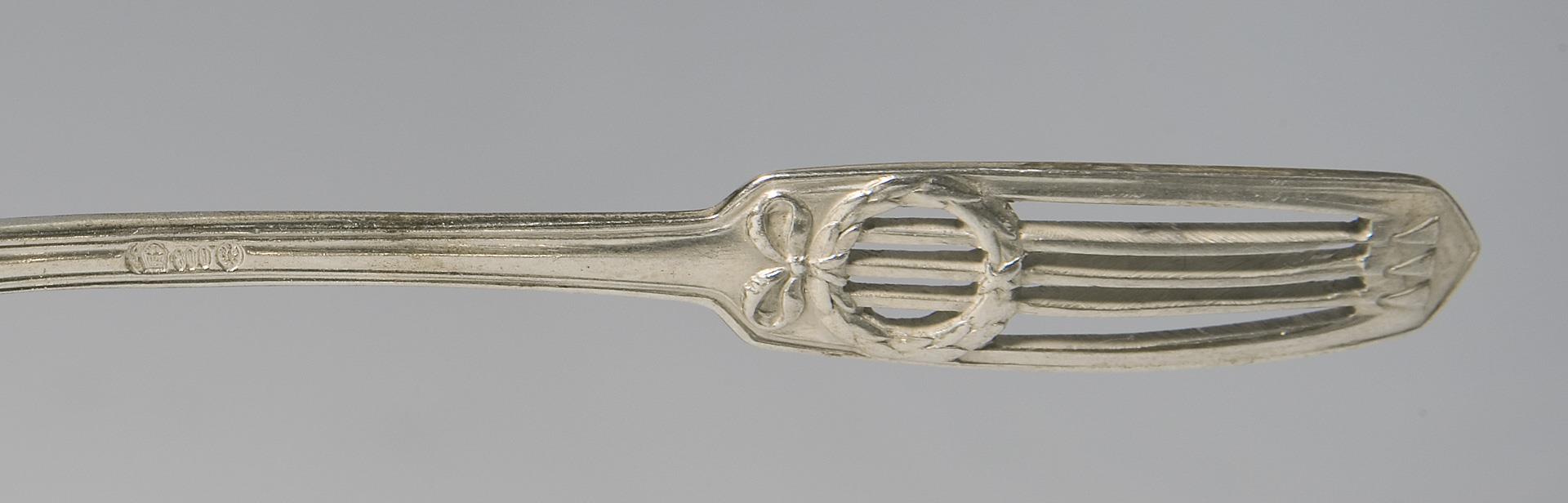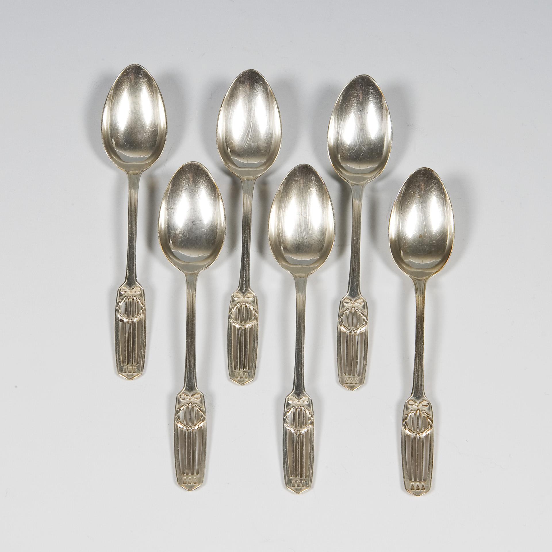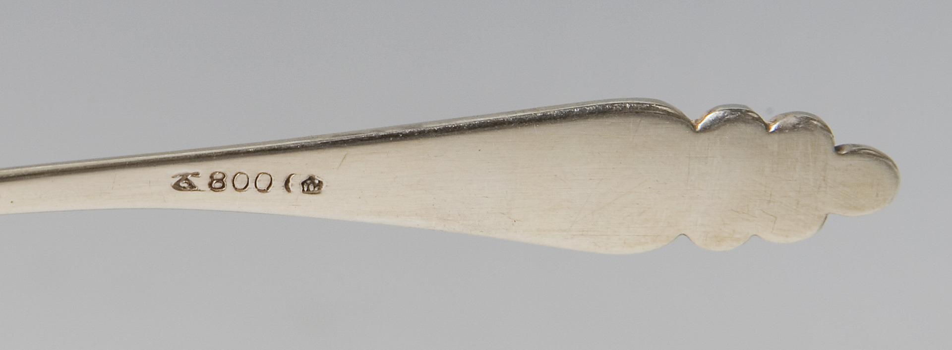 1. Bremer Silberwarenfabrik, 800er Silber, beidseits reliefiert, Namenszug Carl Jasper (Juwelier). 2. Wilkens & Söhne, Hemelingen, 800er Silber, frontal leichtes Hammerschlagdekor, stilisiertes Relief. 3. Koch & Bergfeld, Bremen, 800er Silber, Enden durchbrochen gearbeitet, beidseits reliefiert. 4. W. & S. Sorensen, Denmark, Sterlingsilber, vergoldete durchbrochen gearbeitete Bekrönung. Punzen: 18 Löffel mit Halbmond und Krone, Feingehalt, Manufakturmarke.
